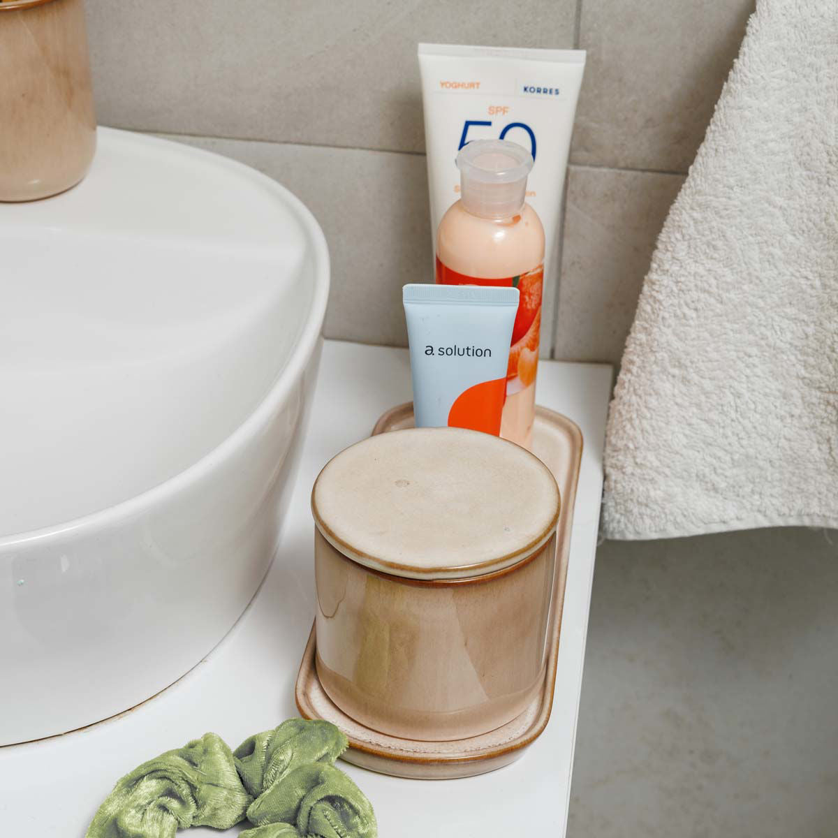 Δίσκος οργάνωσης Estia από τη συλλογή Satin, κατασκευασμένος από ανθεκτικό κεραμικό σε μπεζ χρώμα. Η λεία, ελαφρώς γυαλιστερή επιφάνειά του προσφέρει μια κομψή εμφάνιση, κατάλληλη για το μπάνιο σας ώστε να φαίνεται πάντα καθαρό και προσεγμένο. Ιδανικός για να τοποθετείτε σαπούνια, καλλυντικά ή μικροαντικείμενα, διατηρώντας τον χώρο σας τακτοποιημένο και οργανωμένο.