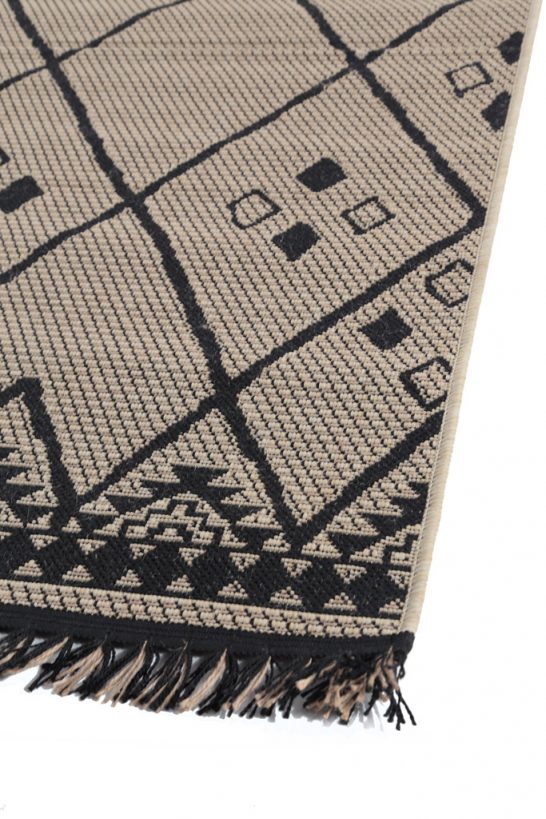 Ψάθινο χαλί Amber σε μαύρο και μπεζ, με έντονη boho αισθητική και γεωμετρικά μοτίβα που δίνουν χαρακτήρα και φυσική ζεστασιά στον χώρο. Κατασκευασμένο από μηχανοποίητη γιούτα, ξεχωρίζει για την ανθεκτική πλέξη του και το διακριτικό κρόσσι που ολοκληρώνει το σχέδιο με αυθεντικό, χειροποίητο ύφος. Οι φυσικοί χρωματισμοί το καθιστούν εύκολα συνδυάσιμο με ξύλο, ουδέτερες αποχρώσεις αλλά και πιο μοντέρνα στοιχεία διακόσμησης. Είναι ελαφρύ, εύκολο στο καθάρισμα και ιδιαίτερα πρακτικό για καθημερινή χρήση, αποτελώντας ιδανική επιλογή για σαλόνι, τραπεζαρία, καθιστικό ή εξοχικό.