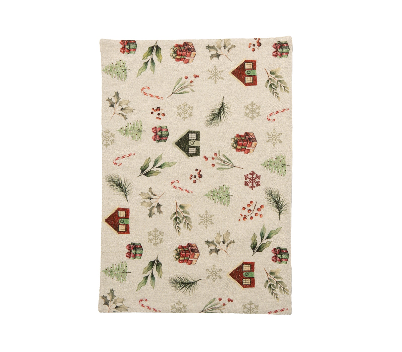 Χριστουγεννιάτικο σουπλά White Christmas της εταιρείας Nef-Nef Homeware, σε εκρού βάση με γιορτινά μοτίβα από δέντρα, σπιτάκια, δώρα και ζαχαρωτά σε αποχρώσεις του πράσινου και του κόκκινου. Δημιουργούν μια ζεστή και χαρούμενη ατμόσφαιρα στο τραπέζι, ιδανική για το χριστουγεννιάτικο πρωινό ή το εορταστικό δείπνο.