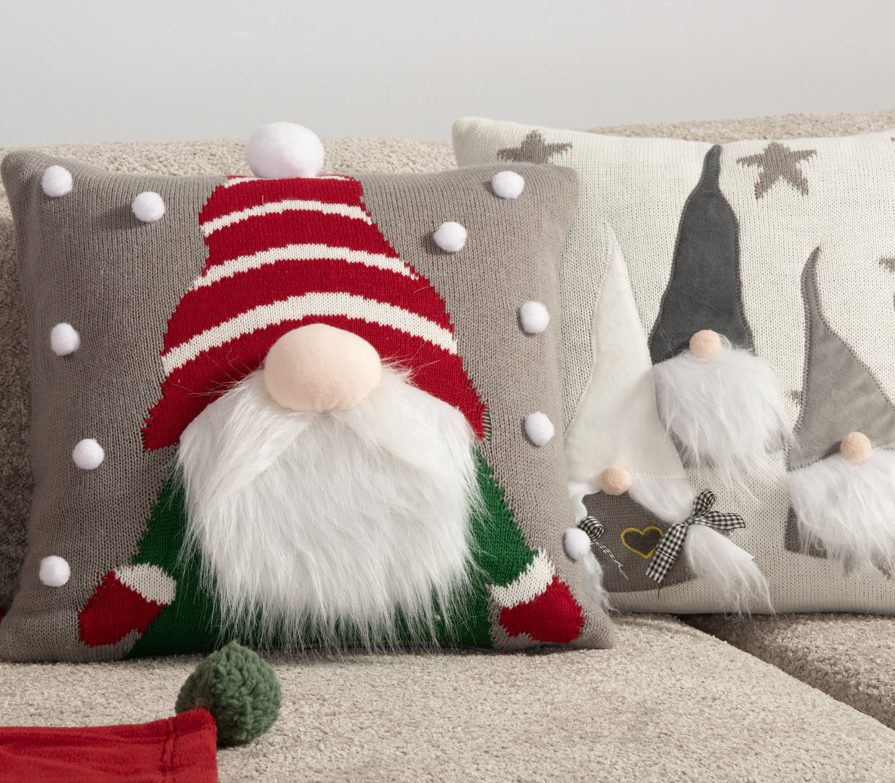Χριστουγεννιάτικη μαξιλαροθήκη Gnome Pom Poms της εταιρείας Nef-Nef Homeware, διάστασης 40x40 cm, σε γκρι χρώμα. Διαθέτει τρισδιάστατο νάνο με κόκκινο-λευκό σκούφο και διακοσμητικά pom poms που θυμίζουν νιφάδες χιονιού. Η απαλή υφή και οι ζωντανές λεπτομέρειες προσθέτουν χαρούμενη, γιορτινή διάθεση στο χώρο, ιδανική για να ολοκληρώσει τη χριστουγεννιάτικη διακόσμηση του σαλονιού.