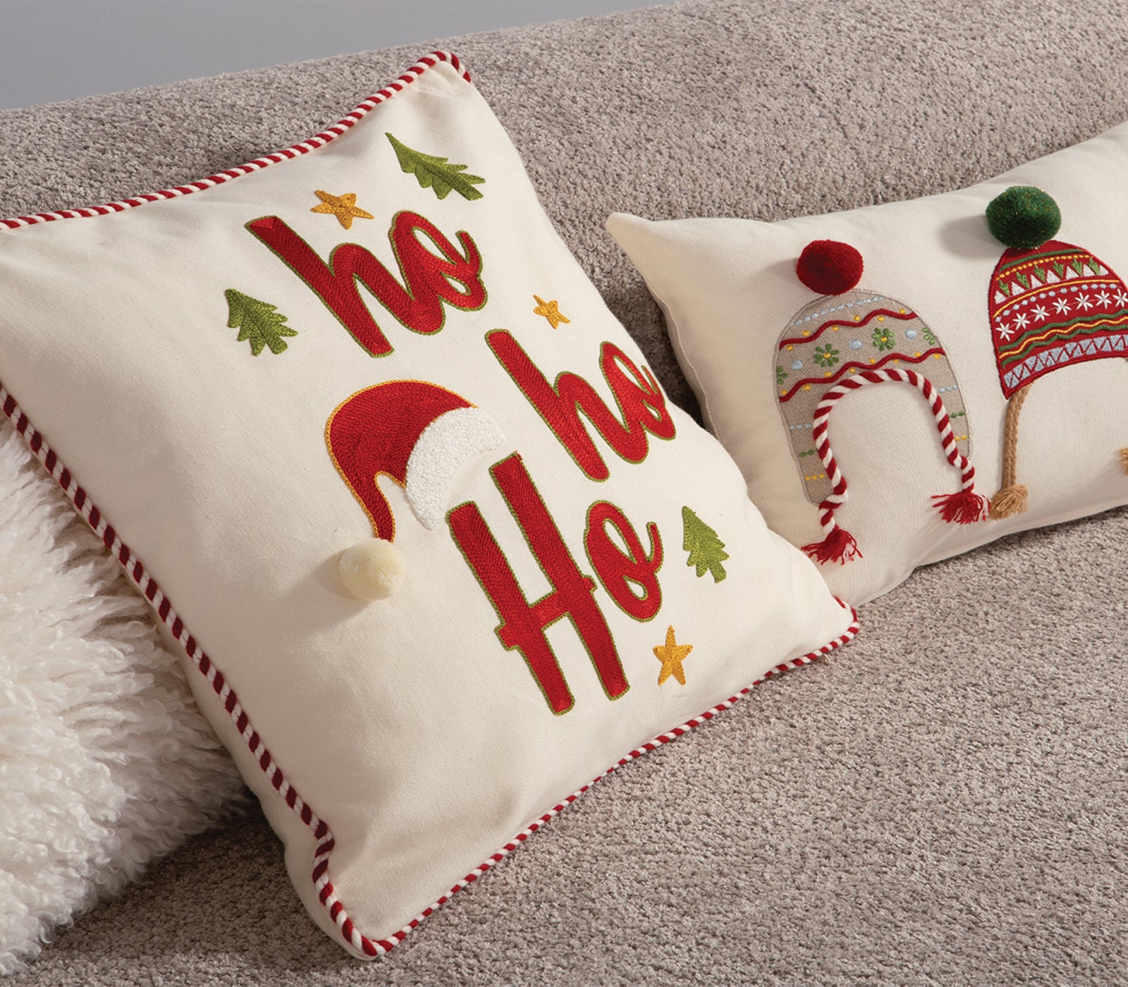 Χριστουγεννιάτικο διακοσμητικό μαξιλάρι White Christmas της εταιρείας Nef-Nef Homeware, σε εκρού χρώμα με κόκκινα γράμματα "Ho Ho Ho", χρυσά αστεράκια και πράσινα δεντράκια. Διαθέτει κεντημένες λεπτομέρειες και διακριτικό περίγραμμα με κόκκινη-λευκή κορδέλα. Μια ζεστή και γιορτινή πινελιά που θα ολοκληρώσει τη χριστουγεννιάτικη διακόσμηση του σπιτιού σας.