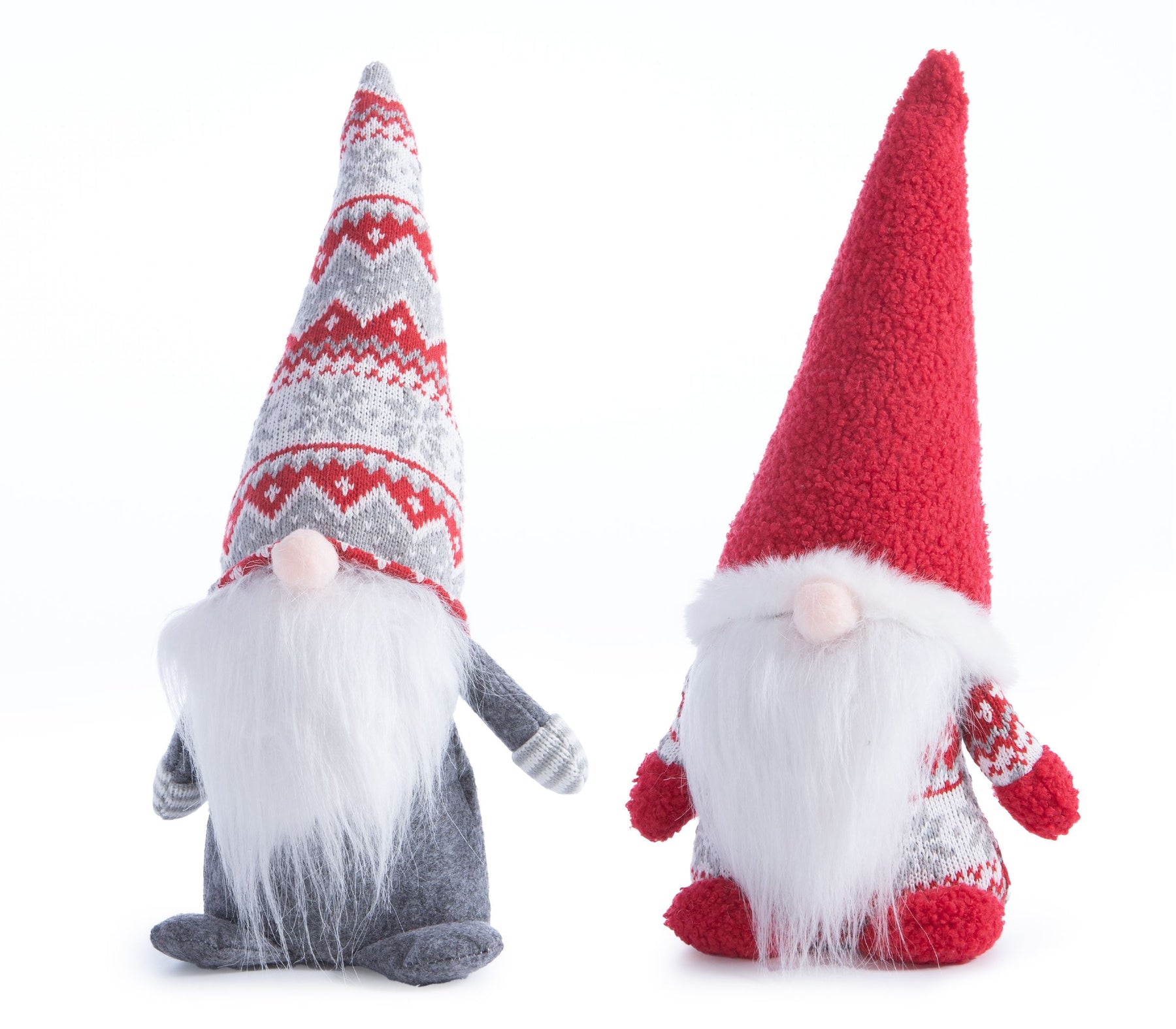 Χριστουγεννιάτικα διακοσμητικα στοπ πόρτας σε σχήμα νάνου, με ψηλό σκούφο και μακριά λευκή γενειάδα — το ένα σε κόκκινο και γκρι με σχέδιο πλέξης και το άλλο σε κόκκινο μονόχρωμο ύφασμα.