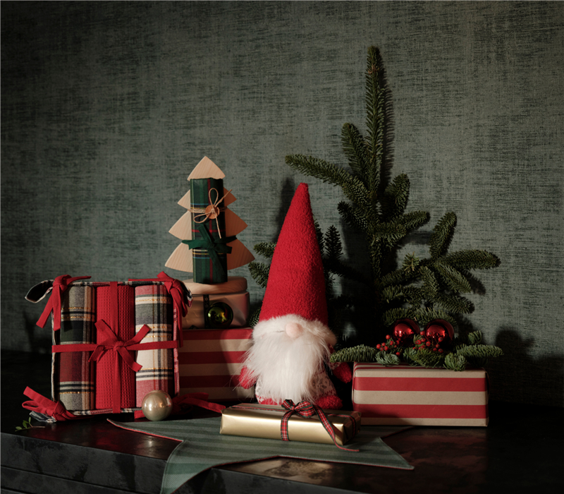 Χριστουγεννιάτικο στοπ πόρτας σε σχήμα νάνου με κόκκινο σκούφο και πλεκτές λεπτομέρειες, διακοσμημένο με δώρα, κουκουνάρια και κλαδιά ελάτου σε γιορτινό σκηνικό.