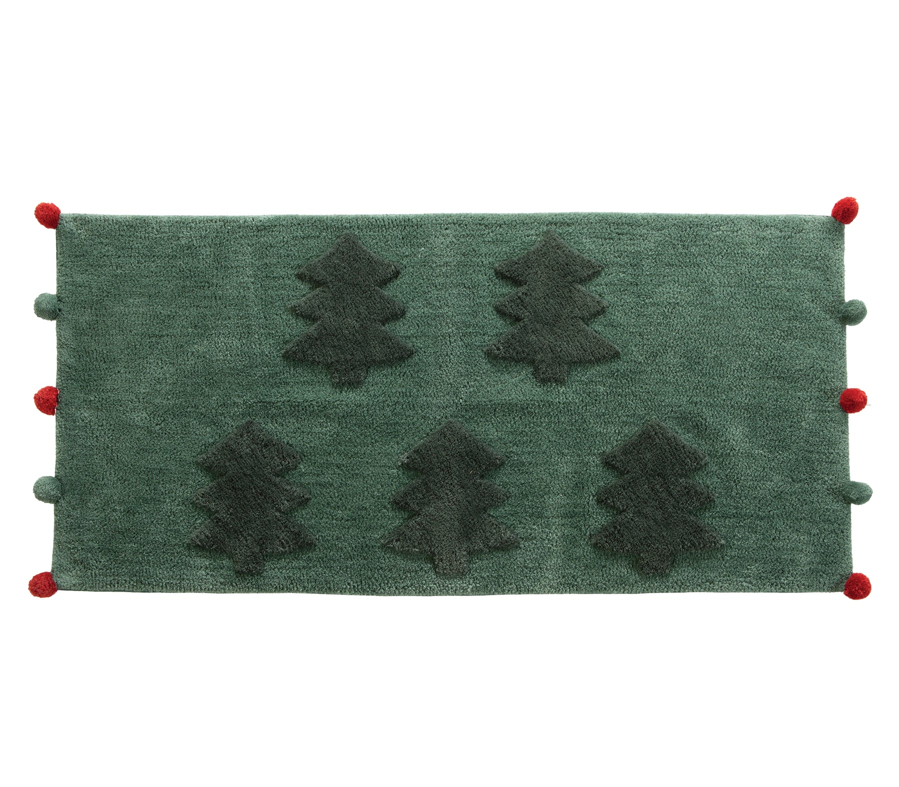 Χριστουγεννιάτικο ταπέτο Trees Of Joy της εταιρείας Nef-Nef Homeware, διάστασης 70x140 cm, σε βαθύ πράσινο χρώμα. Διαθέτει ανάγλυφα σχέδια χριστουγεννιάτικων δέντρων και πομ-πομ στις άκρες σε κόκκινη και πράσινη απόχρωση, χαρίζοντας ζεστή και γιορτινή ατμόσφαιρα στο χώρο. Προσφέρει απαλή υφή, απορροφητικότητα και ανθεκτικότητα, ιδανικό για να διακοσμήσει την είσοδο ή το μπάνιο με festive στυλ.