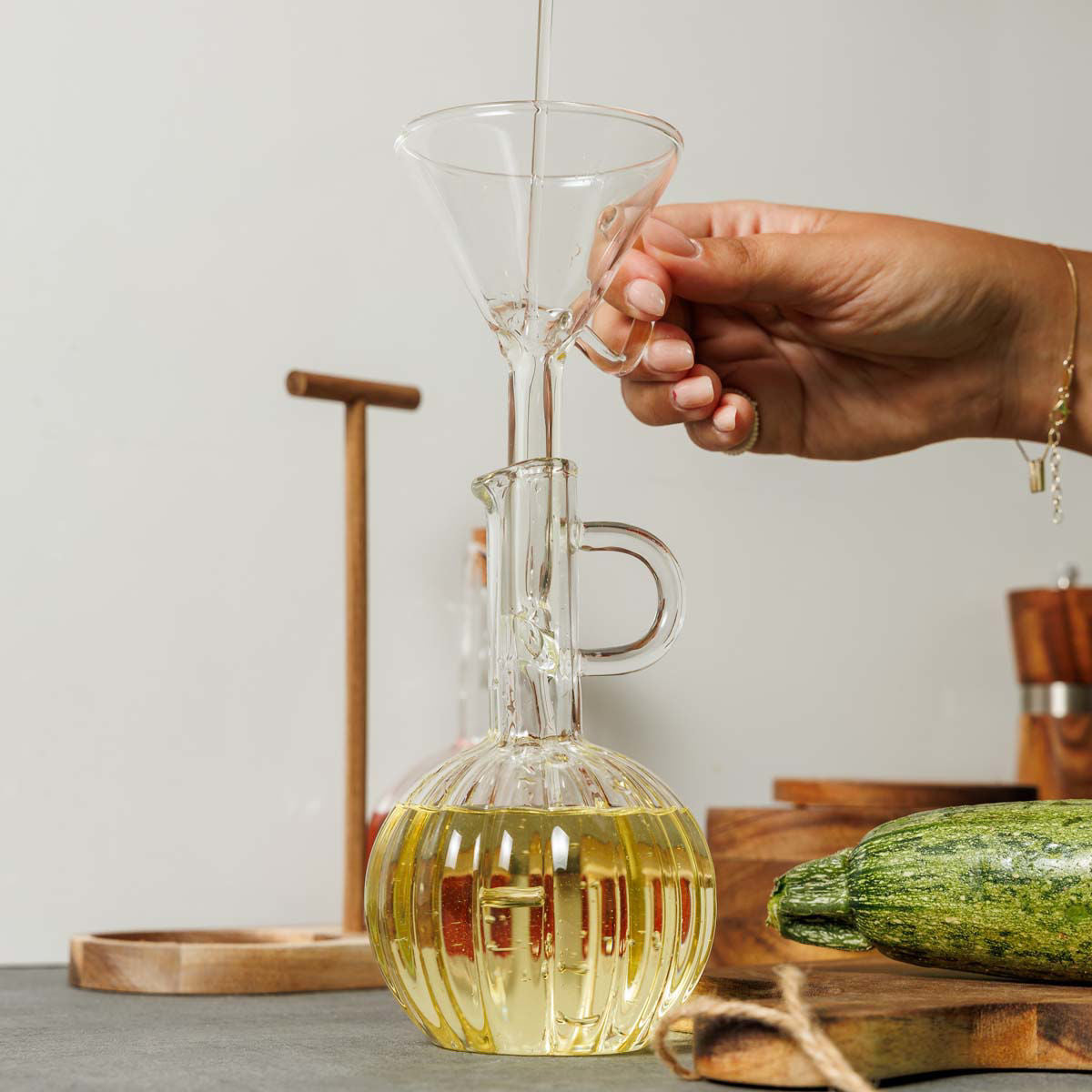 Γυάλινο χωνί Estia Allure, ιδανικό για μετάγγιση λαδιού ή άλλων υγρών με ακρίβεια και καθαριότητα. Κατασκευασμένο από διάφανο, ανθεκτικό γυαλί, επιτρέπει τον πλήρη έλεγχο της ροής, ενώ η πρακτική λαβή εξασφαλίζει άνεση και σταθερότητα στη χρήση.