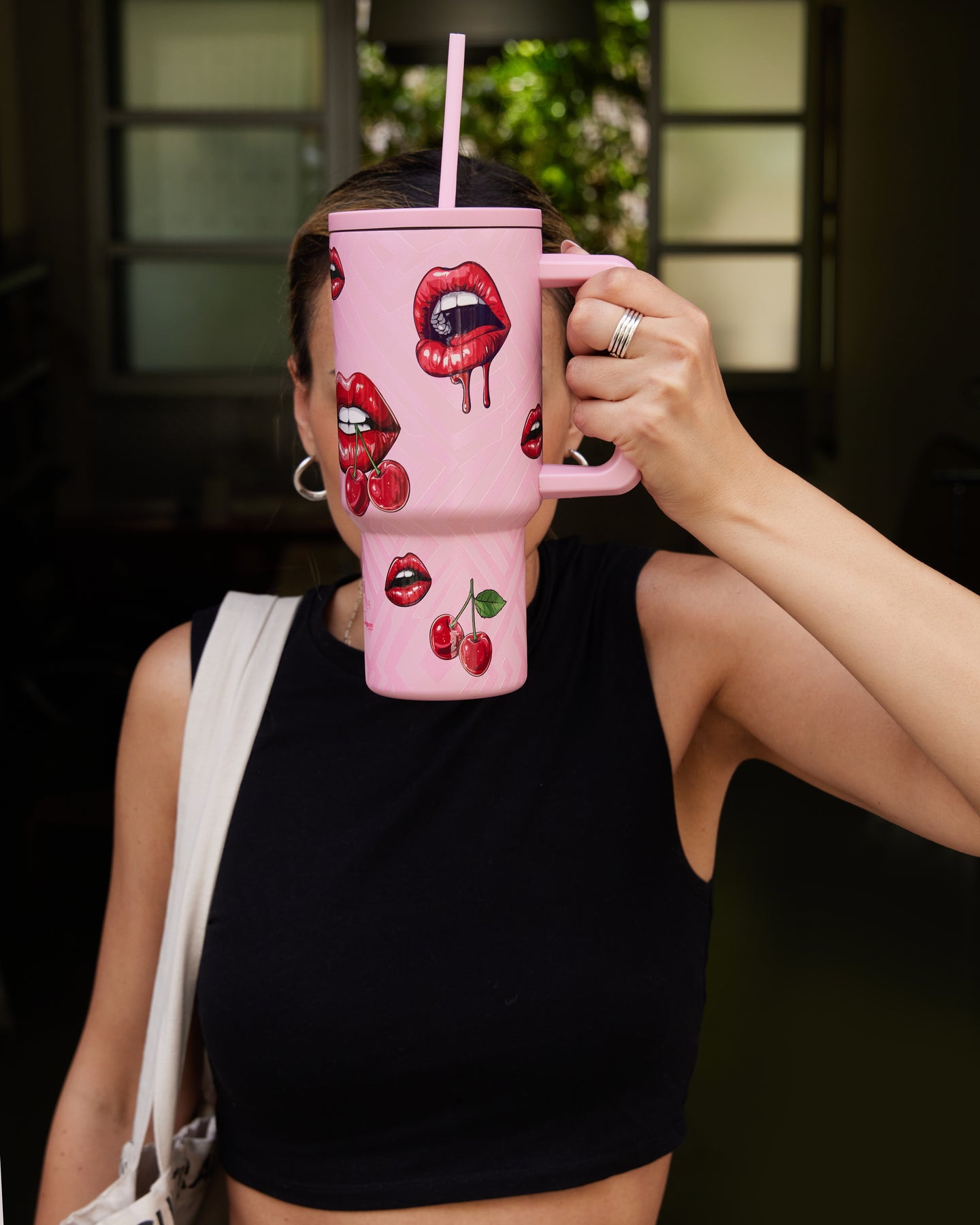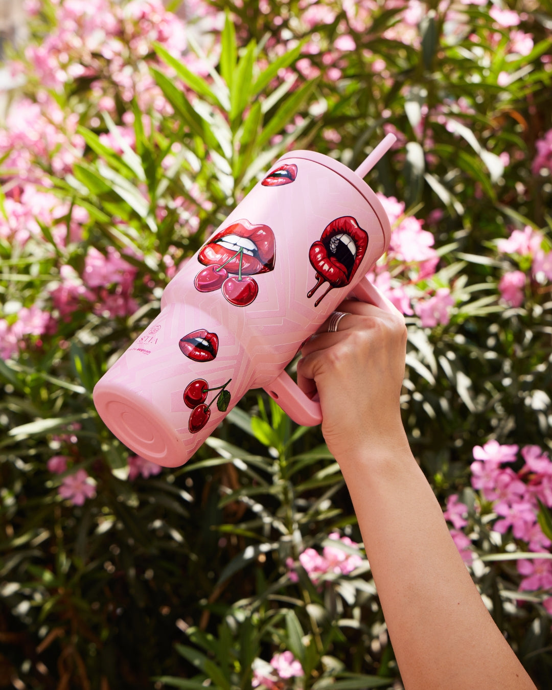 Ποτήρι θερμός StrawTumbler XL σε ροζ χρώμα με σχέδιο χείλη και κερασάκια. Είναι ο ιδανικός σύντροφος για το δρόμο, τη δουλειά, τη βόλτα και το γυμναστήριο! Κατασκευασμένα από υψηλής ποιότητας ανοξείδωτο ατσάλι 18/8, εσωτερικά και εξωτερικά, προσφέρουν απόλυτη ασφάλεια και διατηρούν τη γεύση του ροφήματος αναλλοίωτη. Η μόνωση διπλού τοιχώματος διατηρεί τα ροφήματα σας κρύα έως 12 ώρες και ζεστά έως 6 ώρες, ενώ η εξωτερική βαφή πούδρας προσφέρει ανθεκτικότητα. Με άνετη λαβή για εύκολο κράτημα, αυτό το ποτήρι διαθέτει spill proof καπάκι και επαναχρησιμοποιούμενο καλαμάκι. Ιδανικό για να πίνετε εύκολα και χωρίς να το καταλαβαίνετε την απαιτούμενη ποσότητα νερού που χρειάζεστε μέσα στην ημέρα!