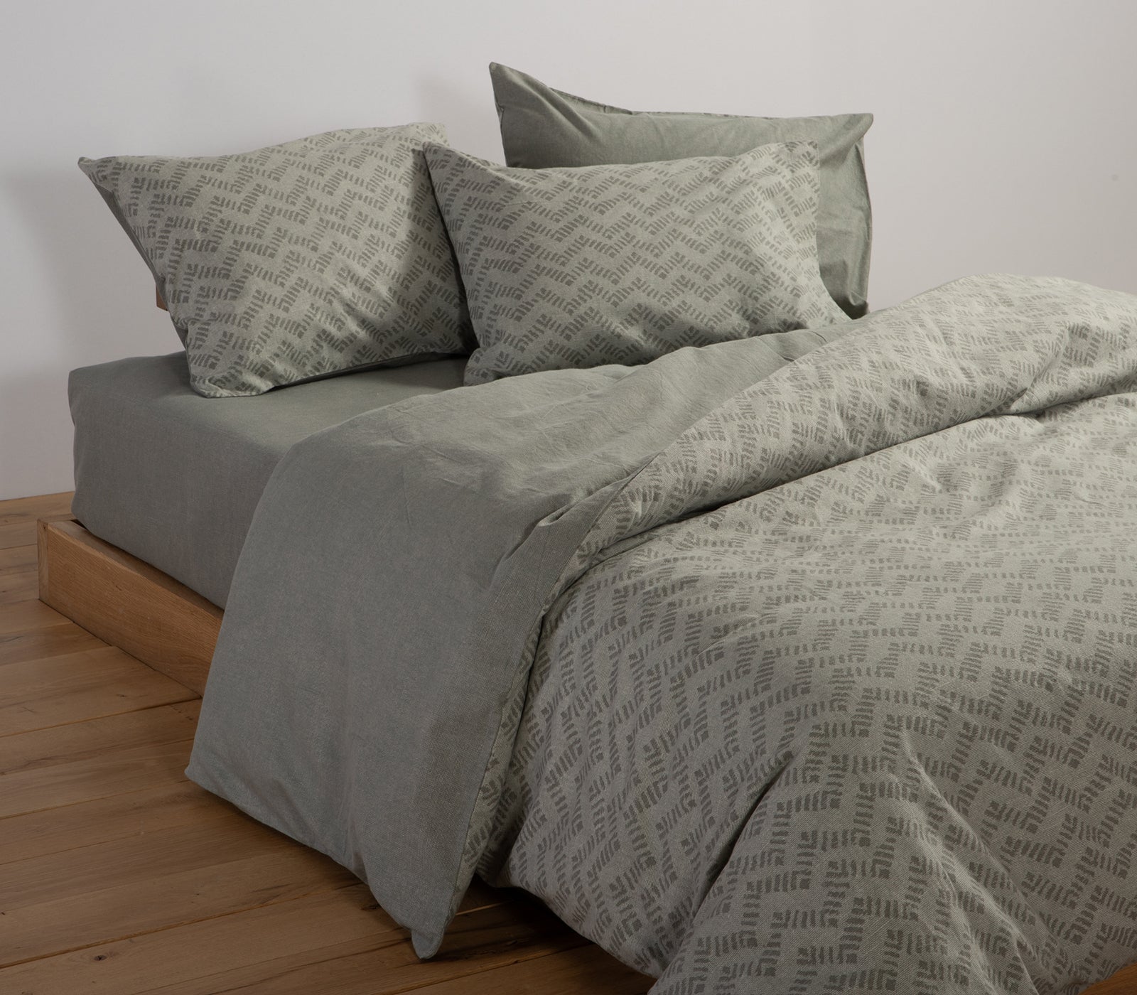 Φανελένια σεντόνια king size σε πράσινη απόχρωση με γραμμικό μοτίβο, από τη συλλογή της εταιρείας Nef-Nef Homeware, κατασκευασμένα από 100% βαμβακερό ύφασμα με επεξεργασία φανέλας και από τις δύο πλευρές. Το σετ περιλαμβάνει ένα πανωσέντονο διάστασης 270x260cm, ένα κατωσέντονο με λάστιχο διάστασης 180x200+32cm. και δύο μαξιλαροθήκες 52x72cm. Το επάνω σεντόνι και οι μαξιλαροθήκες έχουν ανάλαφρο γραμμικό σχέδιο σε φυσική πράσινη απόχρωση, ενώ το κατωσέντονο είναι μονόχρωμο στον ίδιο τόνο. Η υφή της φανέλας και η ήρεμη χρωματική παλέτα δημιουργούν μια cozy και χαλαρωτική ατμόσφαιρα στο υπνοδωμάτιο.