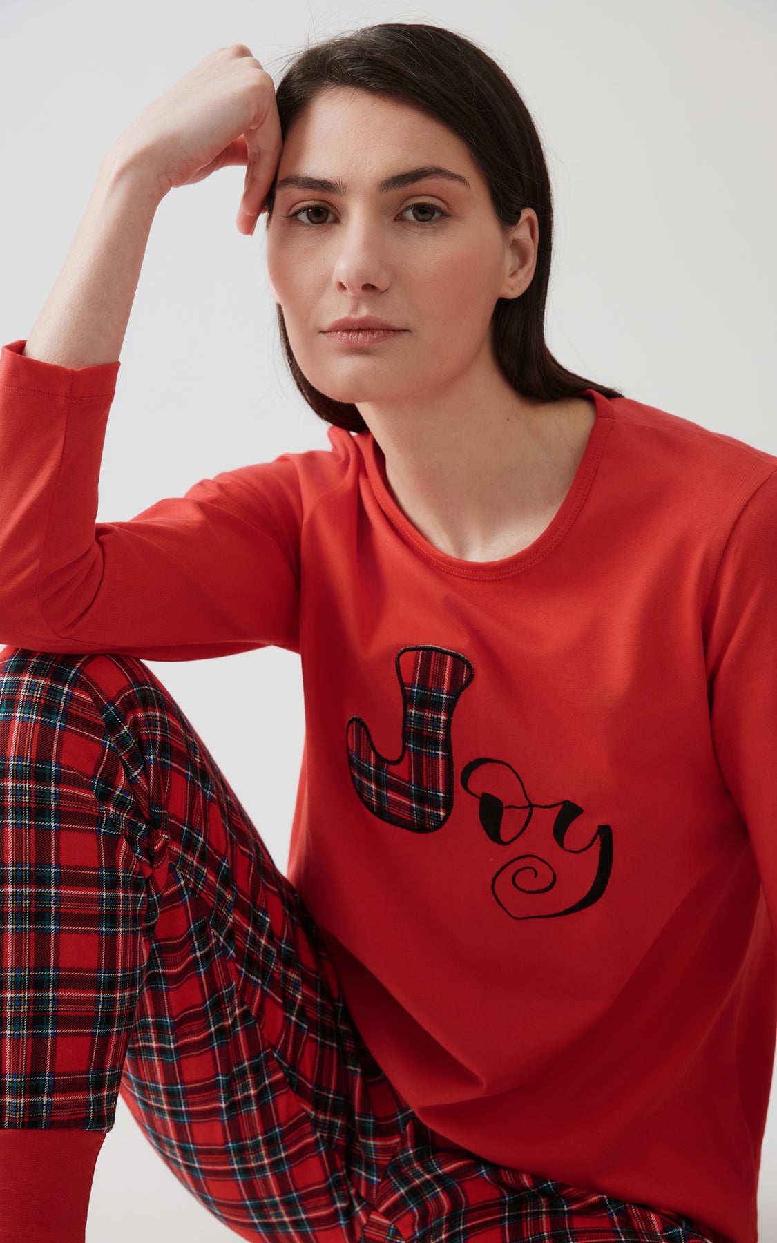 Γυναικεία πιτζάμα της εταιρείας Minerva κατασκευασμένη από 100% βαμβάκι, σε έντονο κόκκινο χρώμα με γιορτινή διάθεση. Η μακρυμάνικη μπλούζα διαθέτει στρογγυλή λαιμόκοψη και διακοσμείται με παιχνιδιάρικο print στο στήθος, ενώ το παντελόνι έχει καρό σχέδιο και τελειώματα με λάστιχο για άνετη εφαρμογή. Η γραμμή είναι χαλαρή και προσφέρει αίσθηση ζεστασιάς και απαλότητας.Ιδανική για τις χειμωνιάτικες νύχτες δίπλα στο τζάκι ή με μια ζεστή σοκολάτα στον καναπέ, γιατί το σπίτι είναι το πιο όμορφο καταφύγιο μας.