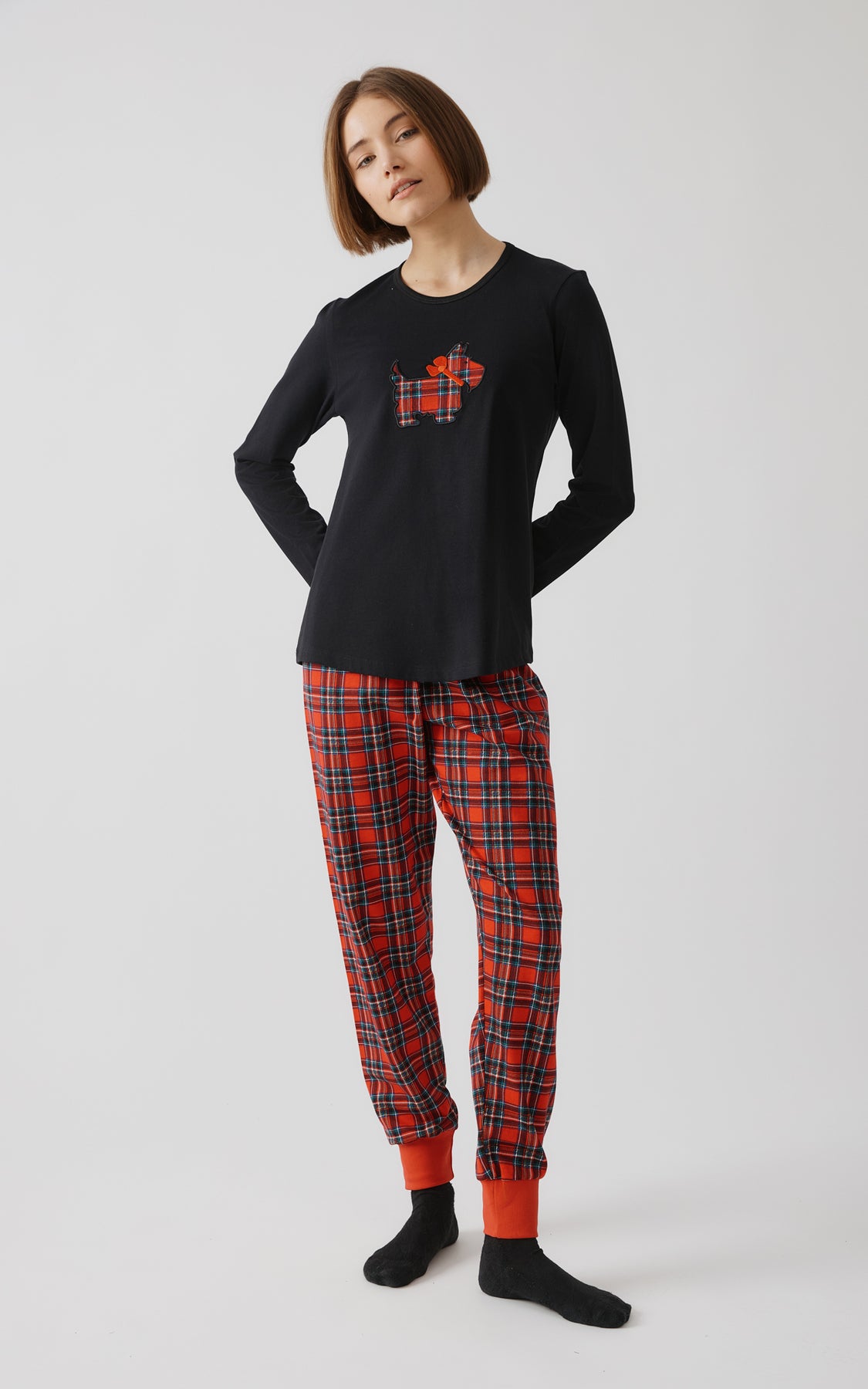 Γυναικεία πιτζάμα της εταιρείας Minerva κατασκευασμένη από 100% βαμβάκι, με μαύρη μακρυμάνικη μπλούζα που διαθέτει στρογγυλή λαιμόκοψη και παιχνιδιάρικο print με καρό σκυλάκι στο στήθος, συνδυασμένη με κόκκινο καρό παντελόνι που έχει λάστιχο στο τελειώμα για άνετη εφαρμογή. Η γραμμή είναι χαλαρή και εξασφαλίζει καθημερινή άνεση και ευκολία στην κίνηση.Ιδανική για πρωινά γεμάτα χαμόγελα και βραδιές με ατμόσφαιρα ζεστασιάς και χαλάρωσης.