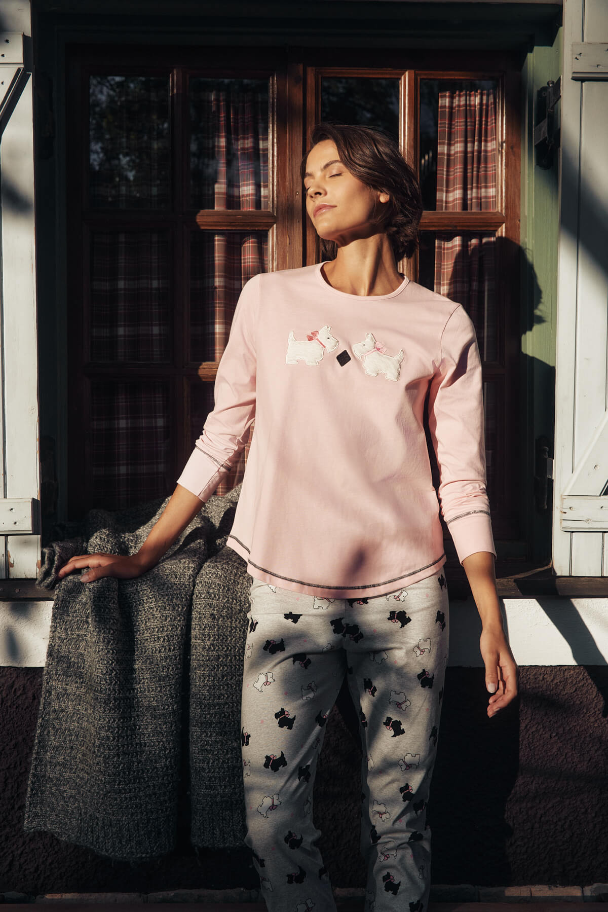 Γυναικεία πιτζάμα της εταιρείας Minerva κατασκευασμένη από 100% βαμβάκι, με μακρυμάνικη ροζ μπλούζα και γκρι παντελόνι σε σετ με χαριτωμένο print από σκυλάκια. Το επάνω μέρος διαθέτει στρογγυλή λαιμόκοψη και παιχνιδιάρικο μοτίβο που αποπνέει ζεστασιά και θετική διάθεση. Το παντελόνι, στην ίδια σχεδιαστική γραμμή, ολοκληρώνει ένα άνετο και μοντέρνο look για το σπίτι. Η βαμβακερή σύνθεση χαρίζει φυσική απαλότητα και ιδανική θερμοκρασία για τις κρύες χειμερινές νύχτες.
