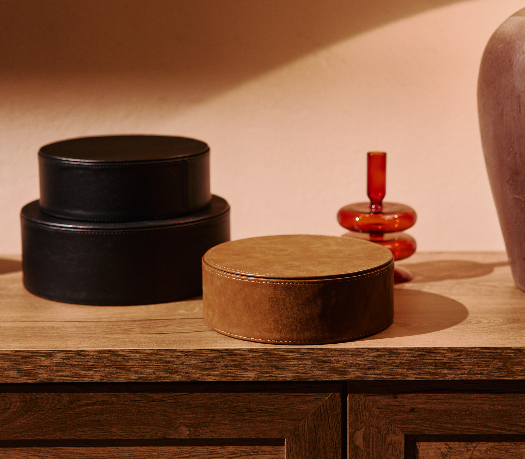 Κουτιά αποθήκευσης Lethal της εταιρείας Nef Nef Homeware, κατασκευασμένα από 100% τεχνητό δέρμα. Το σετ περιλαμβάνει δύο κουτιά διαστάσεων 20x7cm και 26x9cm, που μπορούν να χρησιμοποιηθούν ως διακοσμητικά ιδανικά για να αναβαθμίσουν τη στιλιστική εικόνα του σαλονιού, του υπνοδωματίου ή του γραφείου σας, ενώ παράλληλα προσφέρουν πρακτική αποθήκευση για μικροαντικείμενα και αξεσουάρ. Η στιβαρή κατασκευή τους βοηθά να διατηρούν το σχήμα τους και να προστατεύουν το περιεχόμενο. Ένα μοντέρνο αλλά πρακτικό σετ κουτιών!