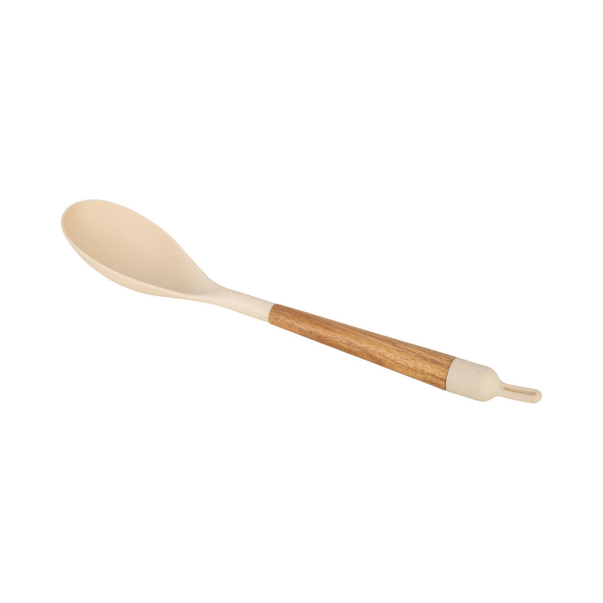 Κουτάλα ραγού Estia Allure σε απόχρωση Ivory, με κομψό συνδυασμό ξύλου ακακίας και PBT. Το PBT είναι θερμοπλαστικό πολυμερές υψηλής αντοχής που δεν χαράζει τις επιφάνειες, αντέχει σε θερμοκρασίες έως περίπου 220°C και παραμένει σταθερό στη θερμότητα, καθιστώντας το ιδανικό για χρήση σε αντικολλητικά σκεύη. Η εργονομική, αντιθερμική λαβή προσφέρει άνεση και ασφάλεια στο κράτημα, ενώ η οπή στο τελείωμα επιτρέπει εύκολο κρέμασμα.