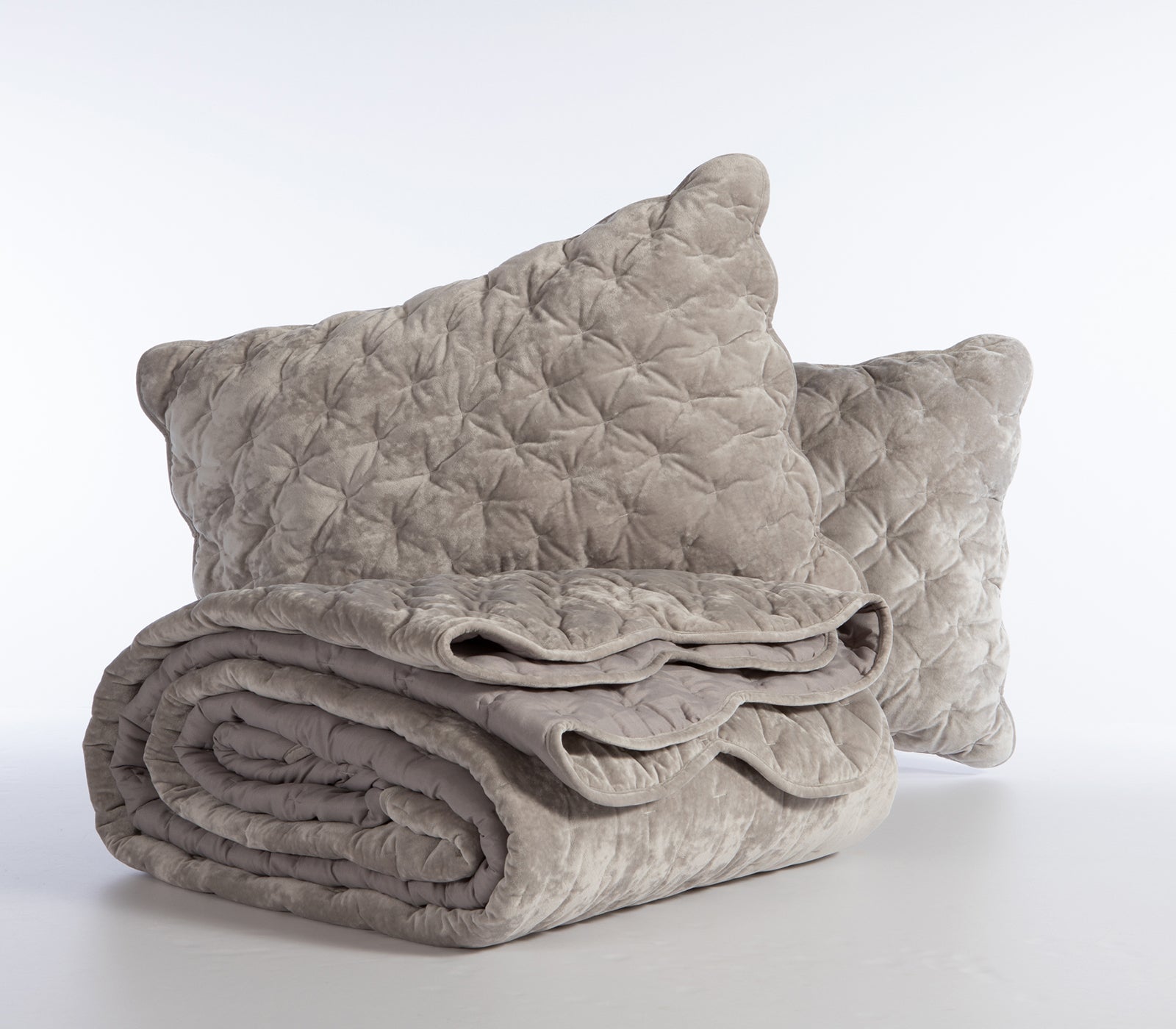 Σετ κουβερλί σε γκρι χρώμα με καπιτονέ σχέδιο και δύο μαξιλάρια, τοποθετημένα σε λευκό φόντο.