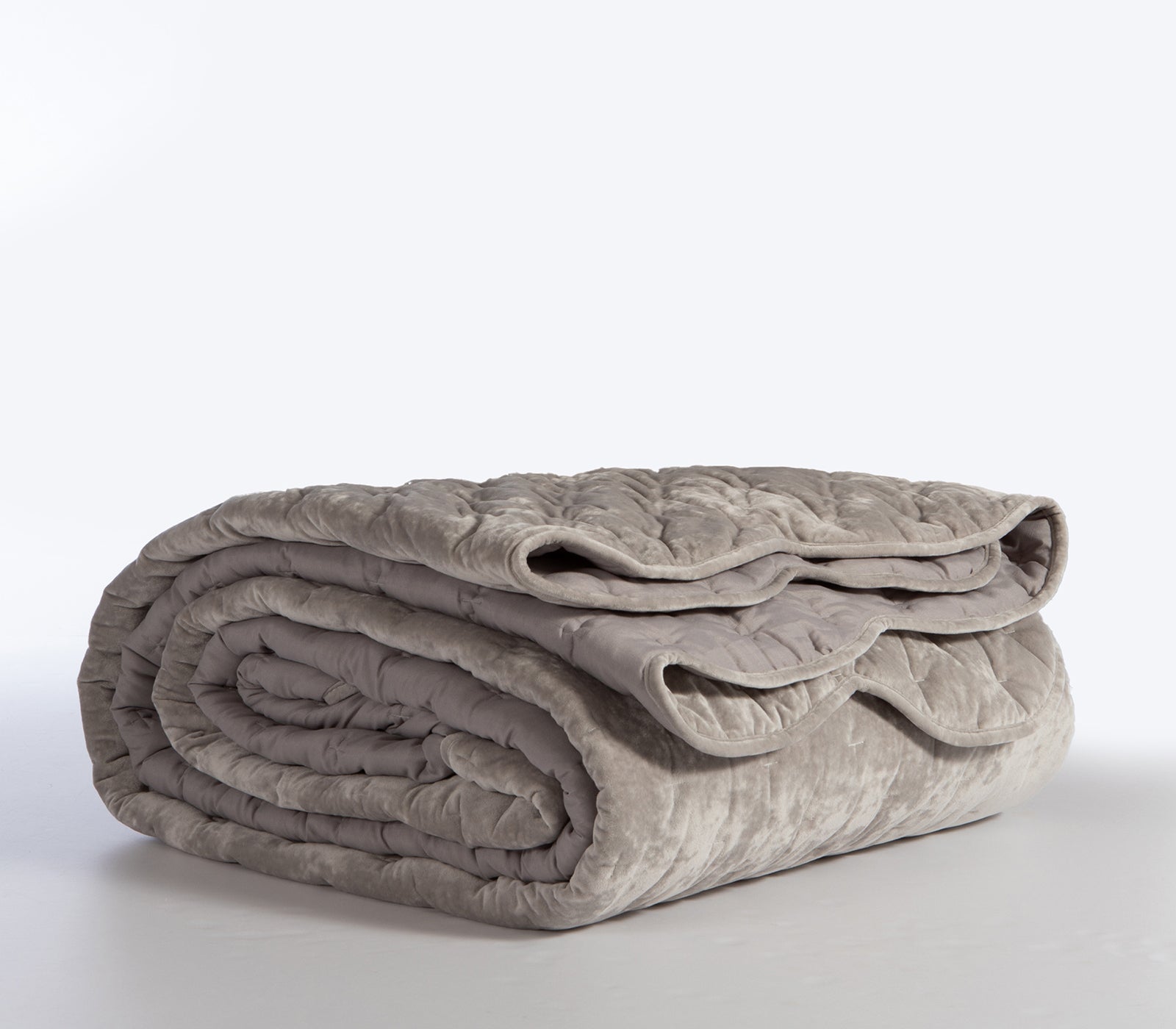 Διπλωμένο κουβερλί σε ανοιχτό γκρι χρώμα με καπιτονέ σχέδιο, σε λευκό φόντο.
