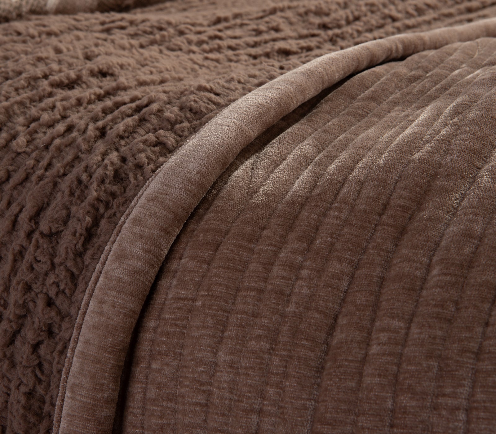 Λεπτομέρεια καφέ κουβερλί με διπλή υφή, εξωτερικά βελούδινη και εσωτερικά γούνινη.