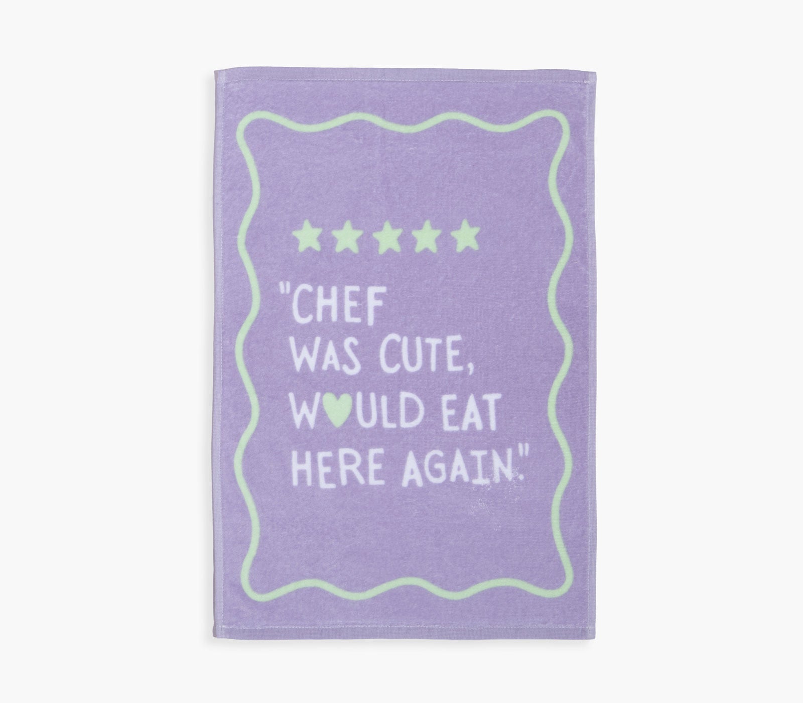 Ποτηρόπανο κουζίνας βελουτέ Chef was Cute της εταιρείας Nef-Nef Homeware, κατασκευασμένο από 100% βαμβάκι. Η βάση του έχει μωβ χρώμα, ενώ διαθέτει λέπτομέρειες με παστέλ πράσινο και λευκό χρώμα. Τα έντονα χρώματα και το χαρούμενο μοτίβο δίνουν μια παιχνιδιάρικη πινελιά στον πάγκο της κουζίνας. Είναι ιδανικό για καθημερινή χρήση λόγω της εξαιρετικής του ποιότητας. Διαθέσιμο σε 3 αποχρώσεις.