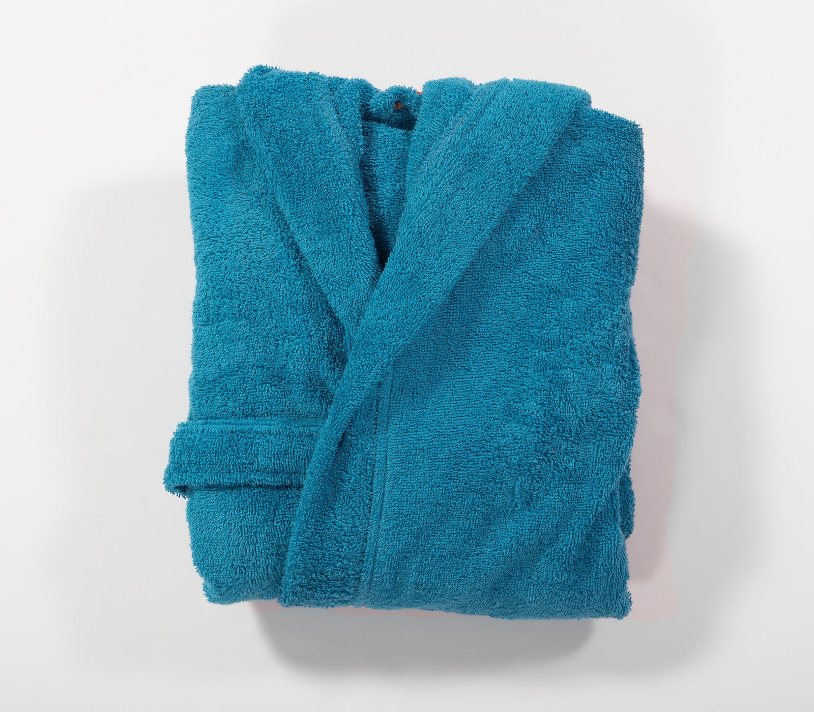 Παιδικό μπουρνούζι σε πετρόλ χρώμα, διπλωμένο τακτοποιημένα, με ζώνη στη μέση και κουκούλα.