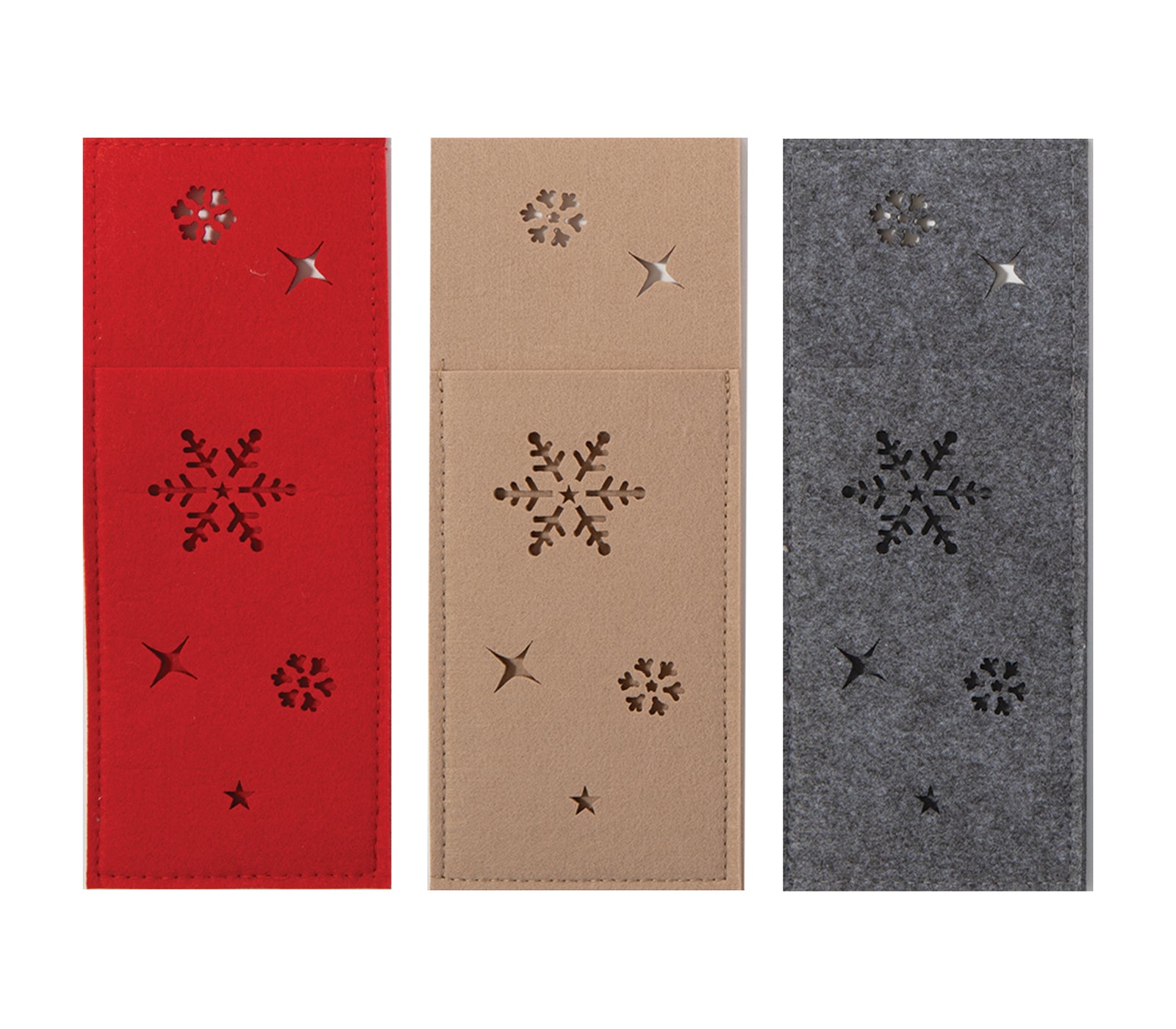 Σετ τριών χριστουγεννιάτικων θηκών για μαχαιροπίρουνα σε κόκκινο, μπεζ και γκρι χρώμα, με κοπτικά σχέδια από αστέρια και νιφάδες χιονιού.