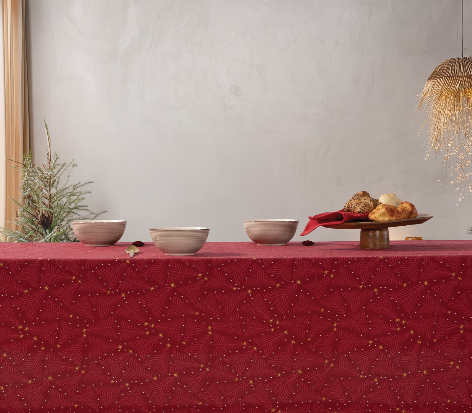Χριστουγεννιάτικο τραπεζομάντηλο December της εταιρείας Nef-Nef Homeware, διάστασης 140x240 cm, σε έντονο κόκκινο χρώμα με διακριτικά μοτίβα δέντρων και αστεριών με χρυσές λεπτομέρειες που χαρίζουν γιορτινή λάμψη. Ιδανικό για να στολίσετε το τραπέζι των Χριστουγέννων και να δημιουργήσετε μια ζεστή, καλαίσθητη ατμόσφαιρα στο χώρο σας με την υπογραφή ποιότητας της Nef-Nef Homeware.