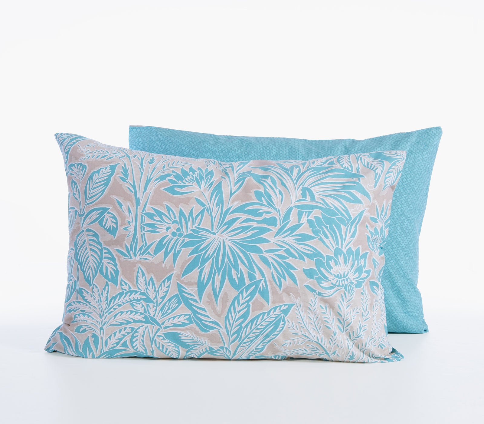 Μαξιλαροθήκη ύπνου της εταιρείας Nef-Nef Homeware κατασκευασμένη από 100% βαμβάκι, με εντυπωσιακό μπλε τροπικό φυλλωτό μοτίβο που αναδεικνύεται πάνω σε απαλό γκρι φόντο. Η φυσική βαμβακερή ύφανση προσφέρει απαλή υφή και ευχάριστη αίσθηση κατά την επαφή με το δέρμα, δημιουργώντας ιδανικές συνθήκες άνεσης κατά τη διάρκεια του ύπνου. Η πίσω πλευρά σε μονόχρωμη μπλε απόχρωση ισορροπεί το σχέδιο και προσθέτει διακριτική κομψότητα στο σύνολο. Ένα σχέδιο που χαρίζει φρεσκάδα και καλοκαιρινή αισθητική, δημιουργώντας μια χαλαρωτική και όμορφα διαμορφωμένη ατμόσφαιρα στην κρεβατοκάμαρα.