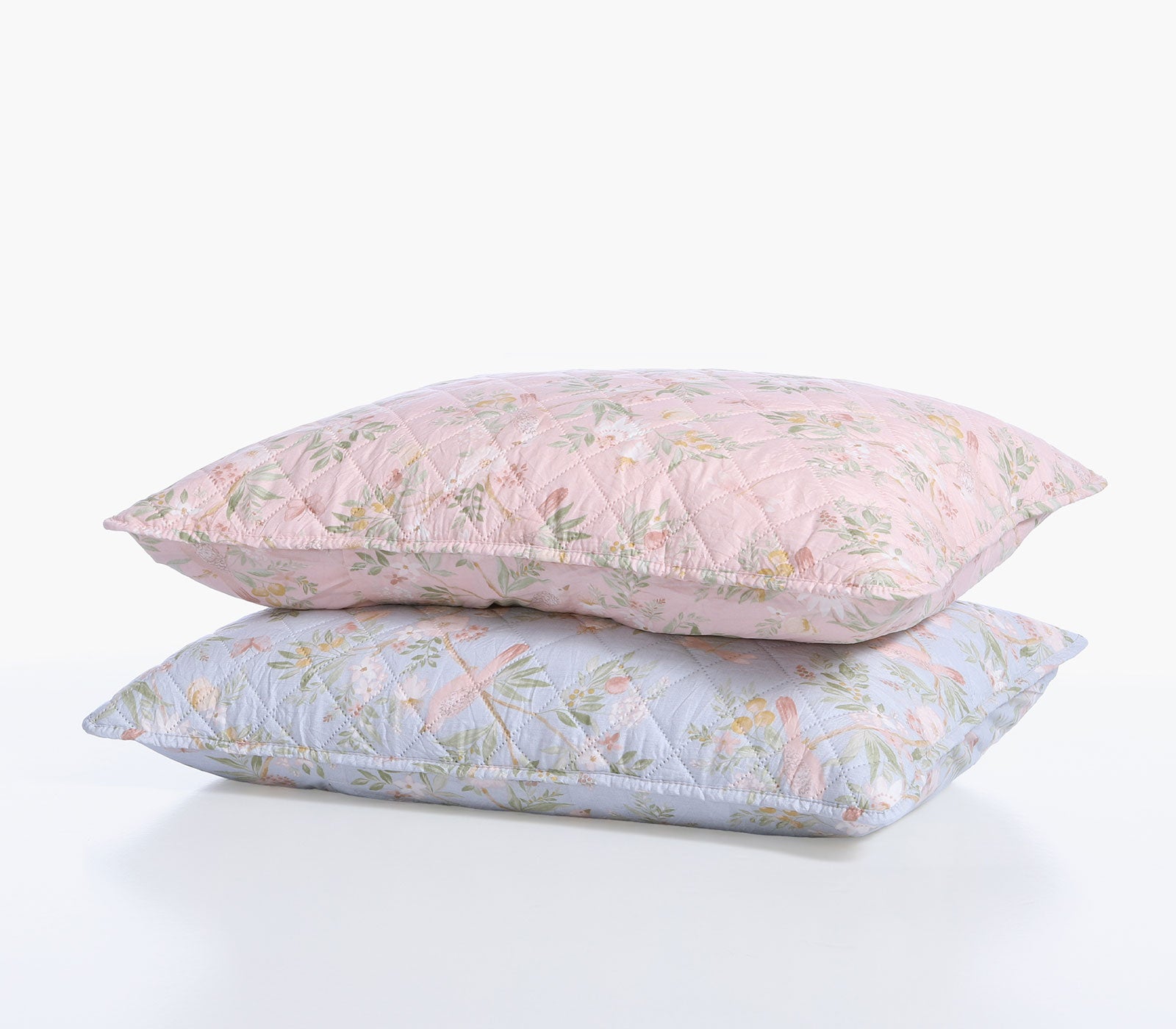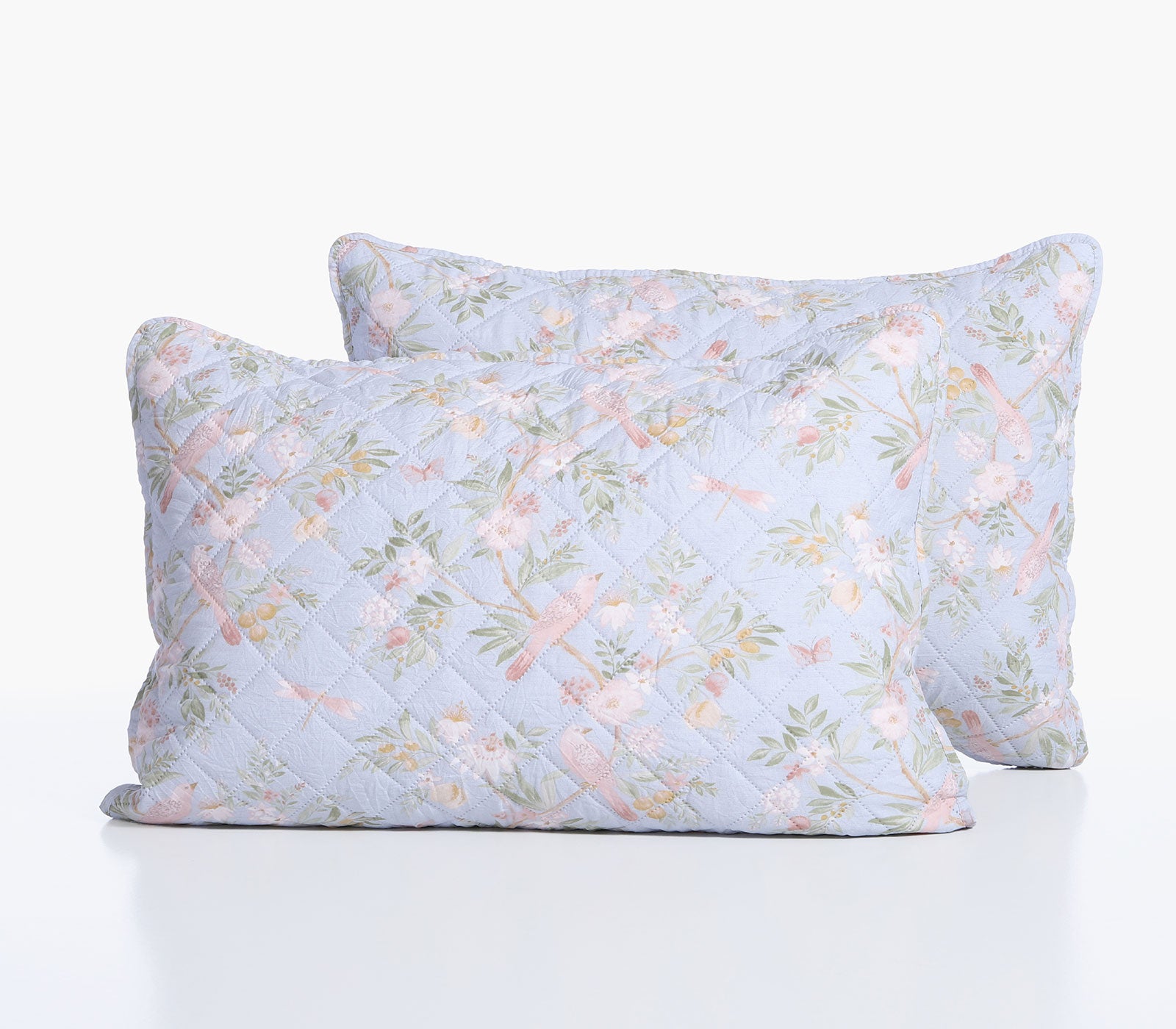 Σετ διακοσμητικές μαξιλαροθήκες 2 τεμαχίων της εταιρείας Nef-Nef Homeware από τη σειρά Dreamel σε απαλή μπλε απόχρωση με ρομαντικό φλοράλ μοτίβο εμπνευσμένο από τη φύση. Η επιφάνειά τους διαθέτει καπιτονέ ραφή σε διακριτικό γεωμετρικό σχέδιο που προσθέτει υφή και κομψότητα στη διακόσμηση του κρεβατιού. Κατασκευασμένες από πολυεστερικό ύφασμα που διατηρεί το σχήμα και τα χρώματά του, προσφέρουν όμορφη εμφάνιση και απαλή αίσθηση. Οι παστέλ τόνοι με λουλούδια και μικρά πουλιά δημιουργούν μια ήρεμη και φωτεινή ατμόσφαιρα που ανανεώνει το υπνοδωμάτιο.