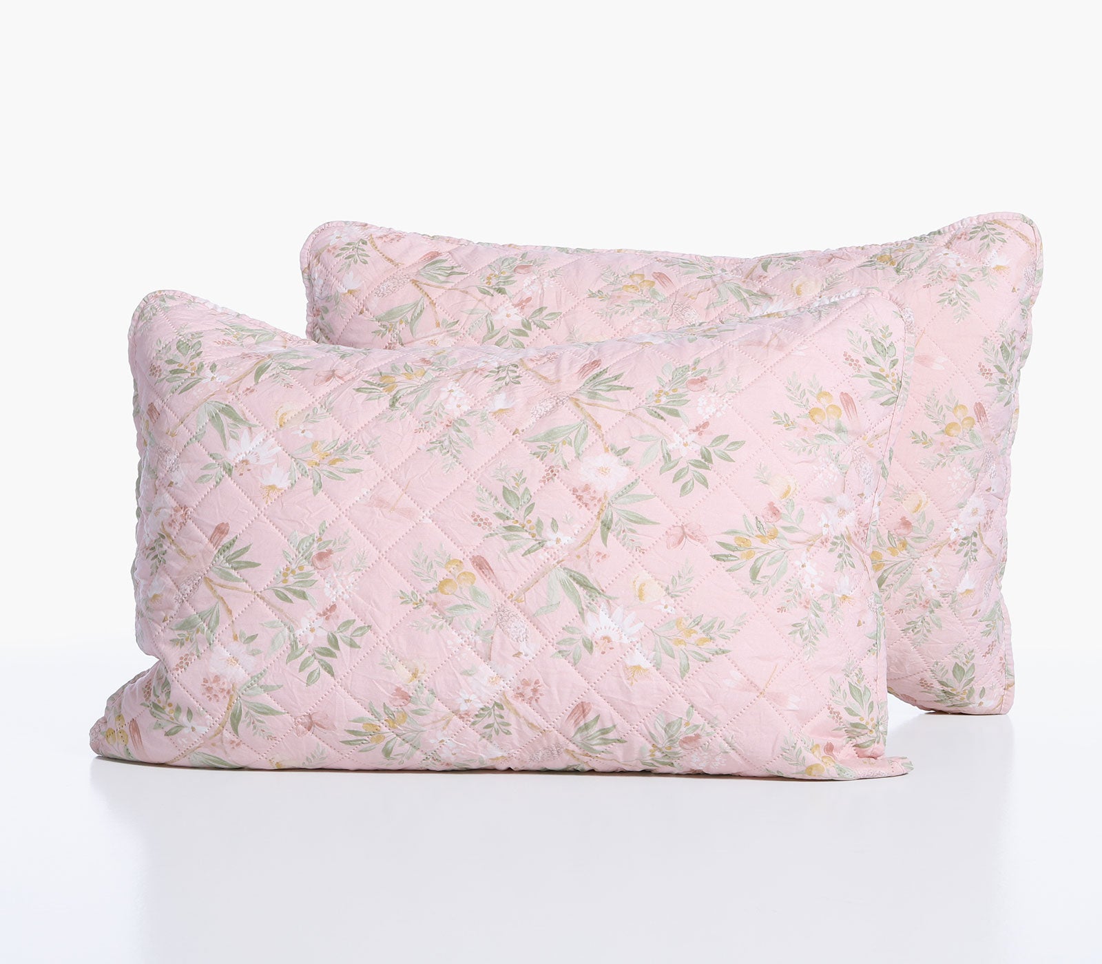 Σετ διακοσμητικές μαξιλαροθήκες 2 τεμαχίων της εταιρείας Nef-Nef Homeware από τη σειρά Dreamel σε απαλή ροζ απόχρωση με ρομαντικό φλοράλ μοτίβο εμπνευσμένο από τη φύση. Η επιφάνειά τους διαθέτει καπιτονέ ραφή σε διακριτικό γεωμετρικό σχέδιο που προσθέτει υφή και κομψότητα στη διακόσμηση του κρεβατιού. Κατασκευασμένες από πολυεστερικό ύφασμα που διατηρεί το σχήμα και τα χρώματά του, προσφέρουν όμορφη εμφάνιση και απαλή αίσθηση. Οι παστέλ τόνοι με λουλούδια και μικρά πουλιά δημιουργούν μια ήρεμη και φωτεινή ατμόσφαιρα που ανανεώνει το υπνοδωμάτιο.