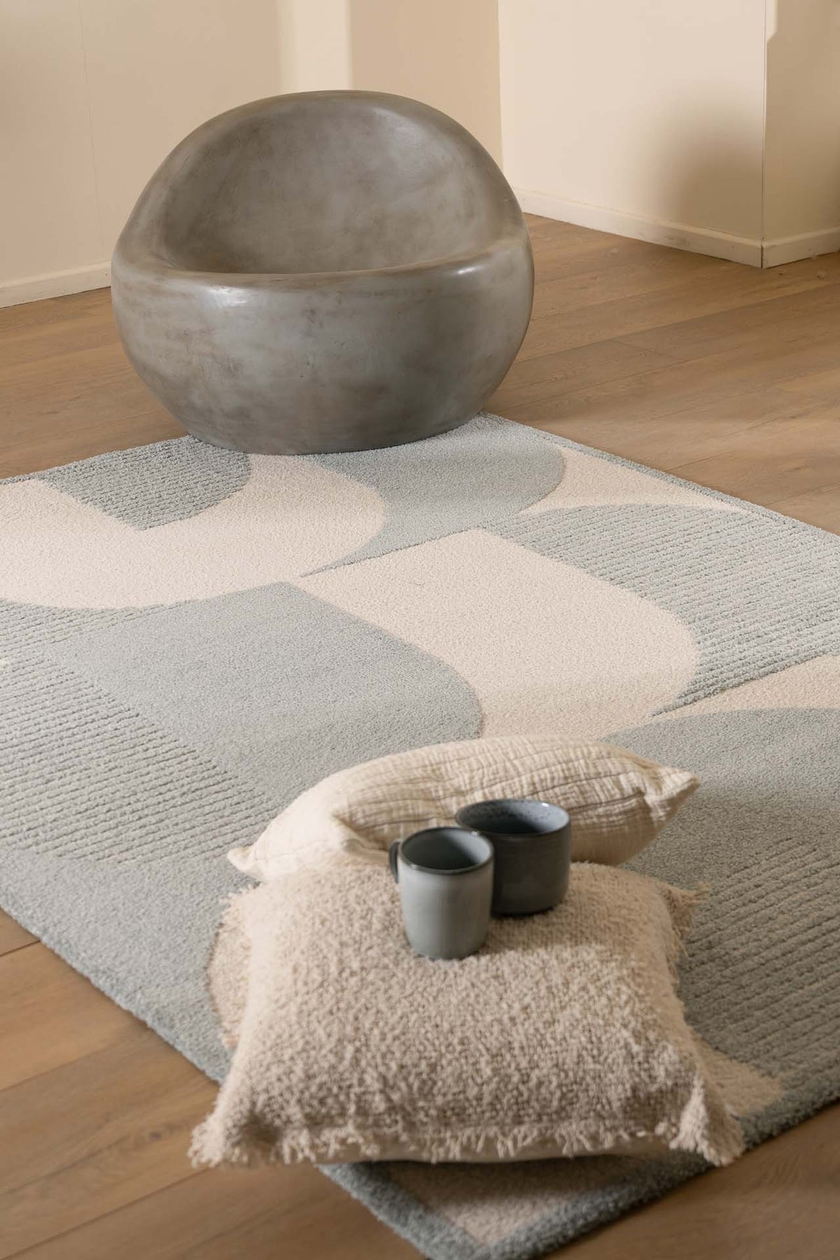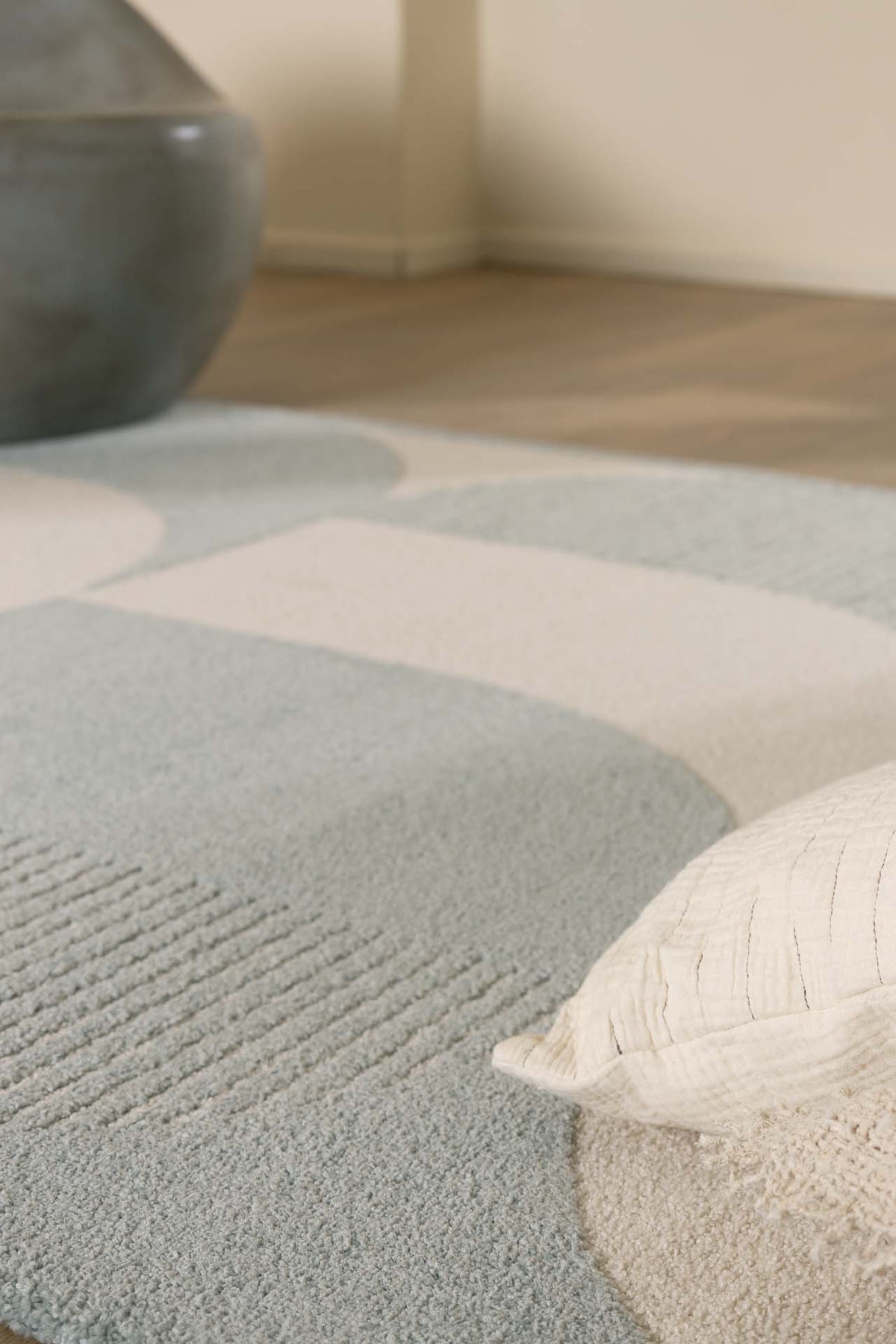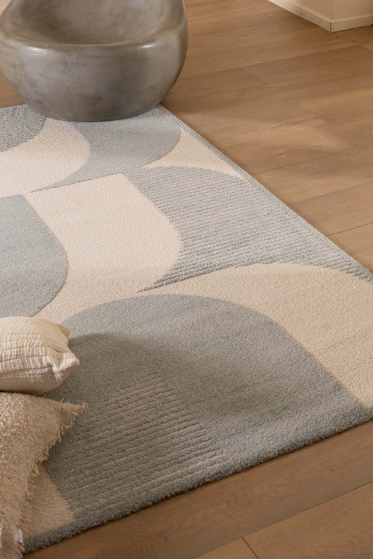 Μοντέρνο χαλί μηχανής Cocoon της εταιρείας Royal Carpet σε διάσταση 200X290cm. Το σχέδιό του συνδυάζει γεωμετρικές φόρμες με ημικύκλια και ριγέ λεπτομέρειες, σε αποχρώσεις γκρι-μπλε και εκρού, δημιουργώντας σύγχρονη και ισορροπημένη αισθητική. Η σύνθεσή του από πολυπροπυλένιο και πολυεστέρα προσφέρει απαλή υφή και άνεση στο πάτημα. Το υφαντό υπόστρωμα χαρίζει ανθεκτικότητα και εύκολο καθάρισμα. Είναι αντιστατικό, ώστε να μη μαγνητίζονται σκόνη, χνούδια και μικροσωματίδια. Υποαλλεργικό και οικολογικό, φιλικό προς την υγεία του ανθρώπου του ανθρώπου του ανθρώπου και το περιβάλλον· οι γεωμετρικές του φόρμες μοιάζουν να «παίζουν» με τον χώρο και ταιριάζουν υπέροχα με λευκά είδη του καταστήματός μας για μια ολοκληρωμένη και ζωντανή διακόσμηση.