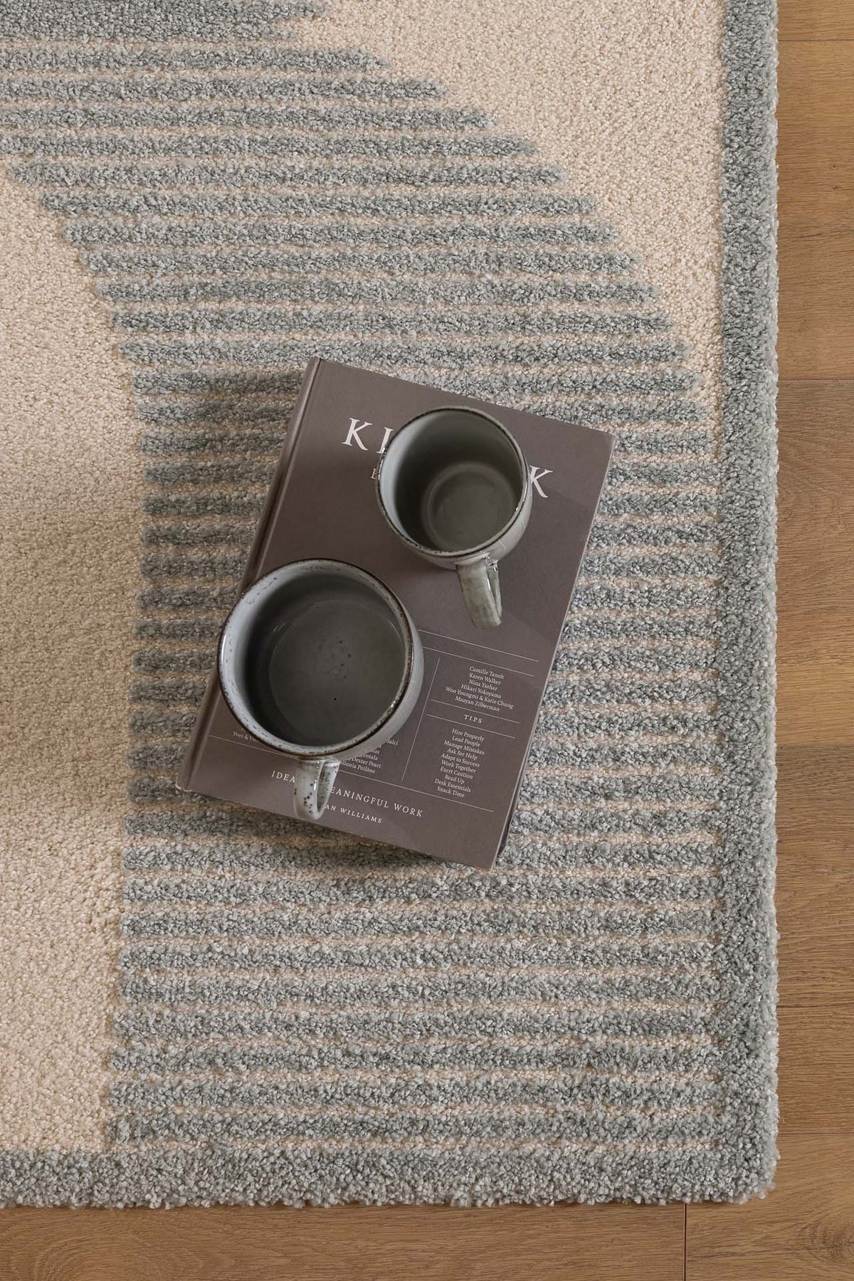 Χαλί σε γκρι και εκρού τόνους με γεωμετρικό μοτίβο, διακοσμημένο με δύο φλιτζάνια και βιβλίο.