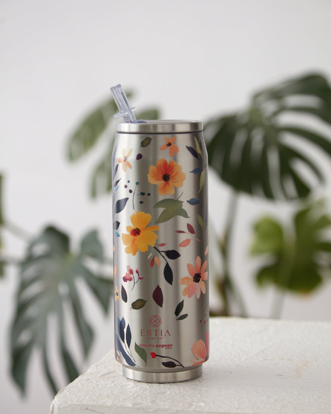 Estia Ποτήρι Θερμός Με Καλαμάκι Save The Aegean 500ml Μεταλλικό Φλοράλ Silver Botanic Travel Cup