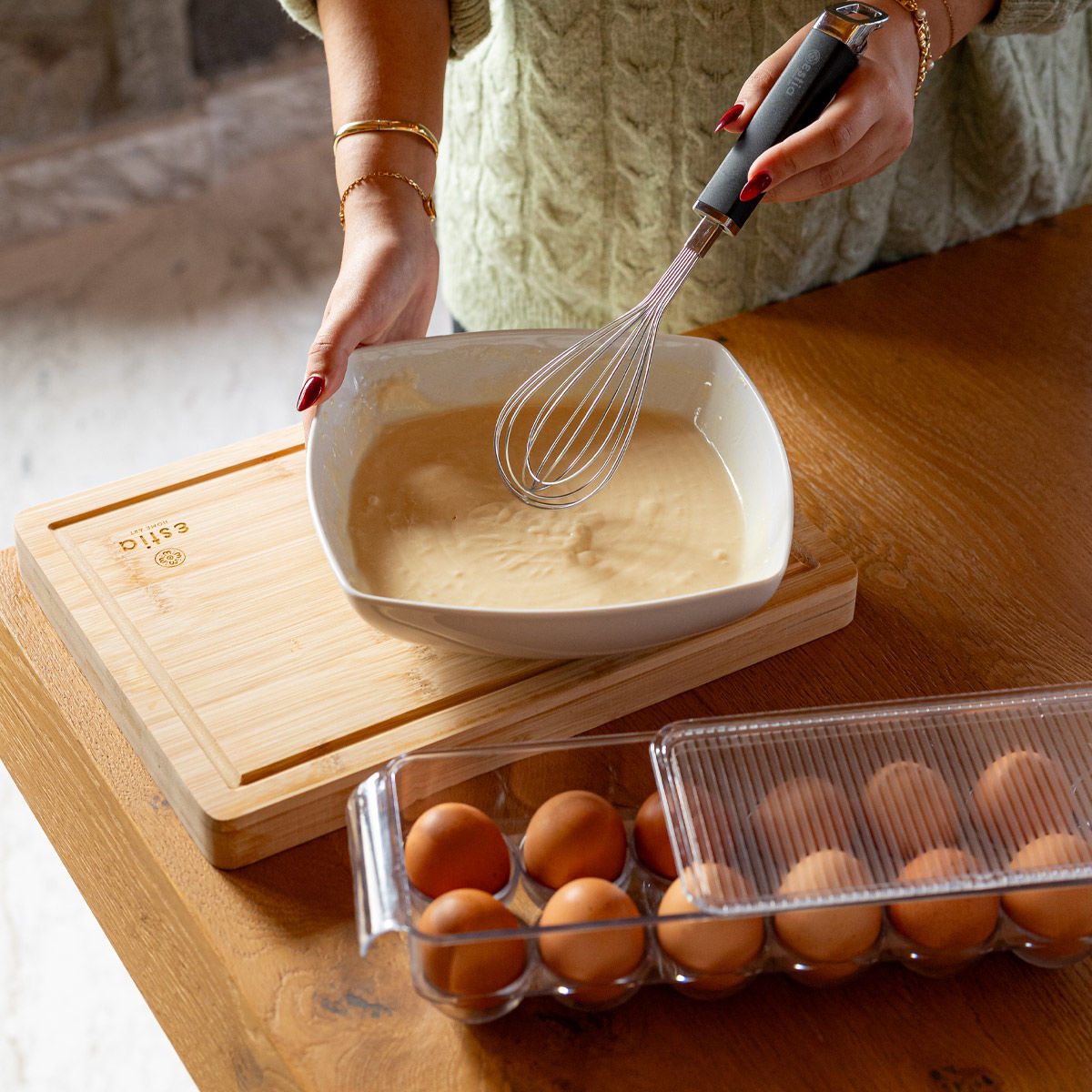 Το κουτί αυγών Estia τοποθετημένο σε ξύλινο πάγκο με καπάκι, μπροστά από σκηνή προετοιμασίας συνταγής.