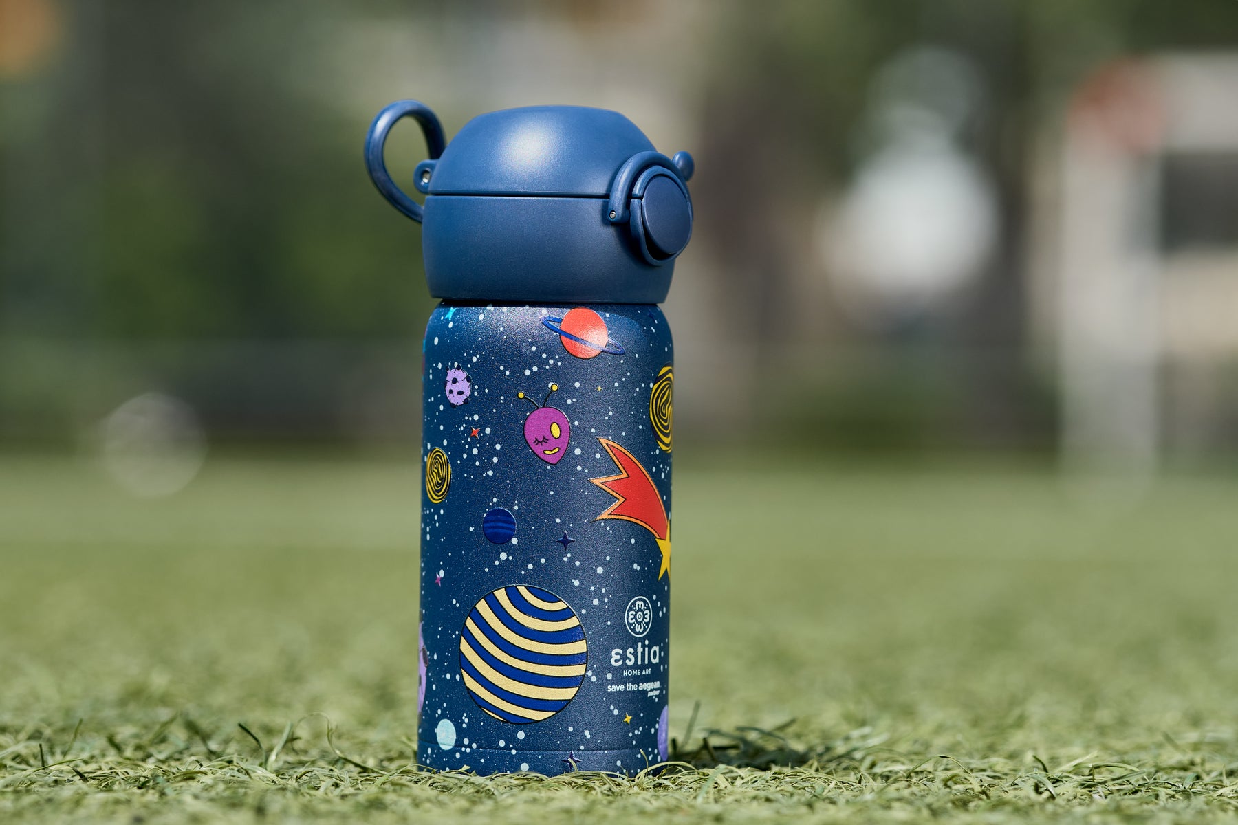 Παιδικό Θερμός σε μπλε χρώμα και σχέδιο με πλανήτες της εταιρίας Estia χωρητικότητας 350ml. Είναι κατασκευασμένο από ανοξείδωτο ατσάλι 18/8 και διαθέτει εσωτερικά εύκαμπτο καλαμάκι σιλικόνης. Διατηρεί το ρόφημα ζεστό ή κρύο έως 6 ώρες χάρη στο διπλό τοίχωμα που προσφέρει μέγιστη μόνωση. Το καπάκι ασφαλείας ανοίγει με το πάτημα του μπροστά κουμπιού και αποτρέπει από διαρροές, ενώ το μεγάλο στόμιο διευκολύνει το καθάρισμά του. Η επίστρωση με πούδρα μεγάλης αντοχής διατηρεί το χρώμα αναλλοίωτο. Η ιδανική επιλογή για το σχολείο, τη βόλτα και τις δραστηριότητες του μικρού σας. Συνδυάστε το με τάπερ & ισοθερμική τσάντα φαγητού για ένα ολοκληρωμένο σετ.