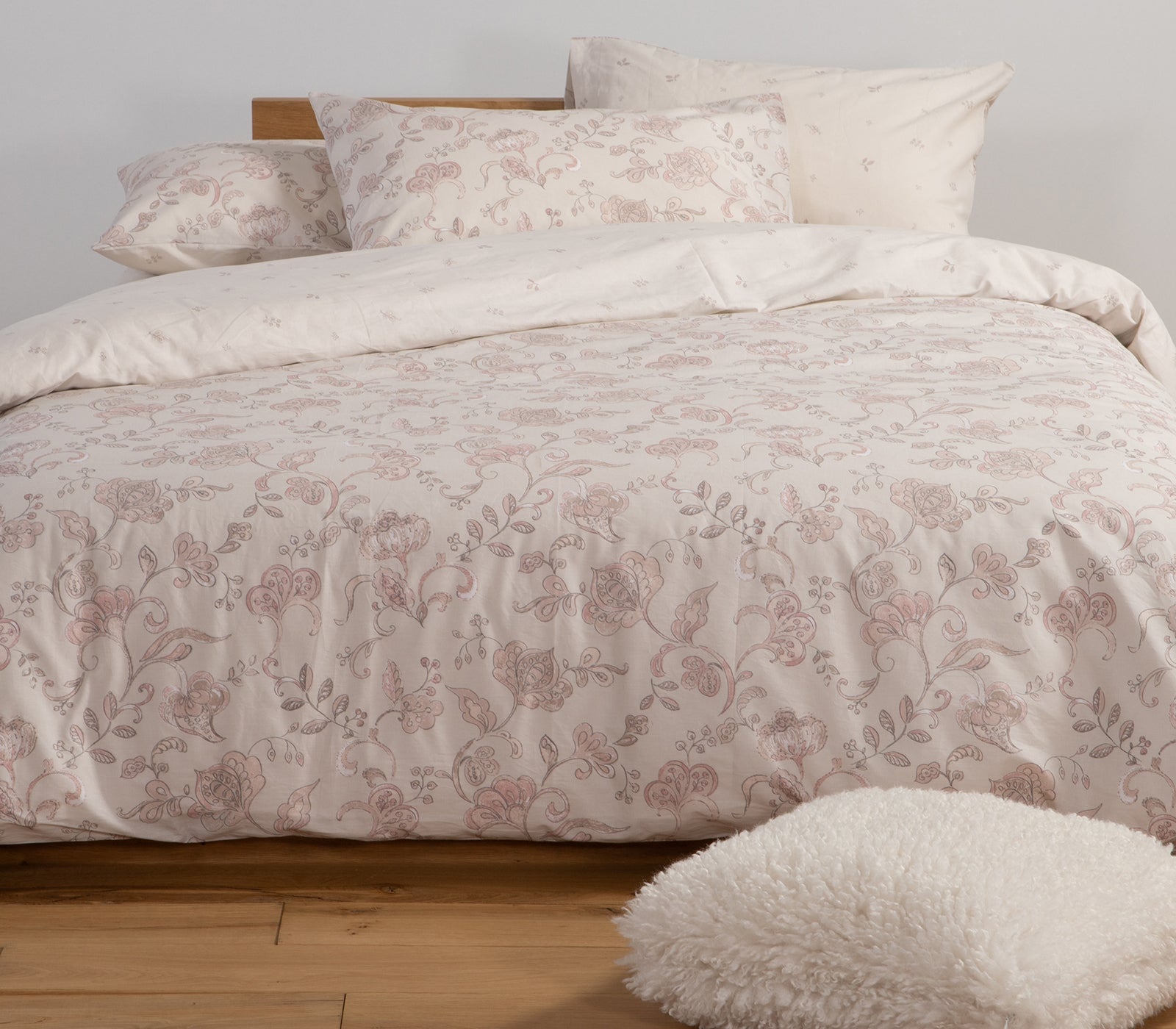 Σετ παπλωματοθήκη υπέρδιπλη σε απαλό γκρι χρώμα με φλοράλ μοτίβο της εταιρείας Nef-Nef Homeware, κατασκευασμένη από 100% βαμβάκι. Το σετ περιλαμβάνει μία παπλωματοθήκη διάστασης 240x230 cm με φερμουάρ και ρομαντικό σχέδιο λουλουδιών σε τόνους ροζ και γκρι, καθώς και μία μαξιλαροθήκη διάστασης 52x72 cm διπλής όψης ,η μία πλευρά με το λουλουδάτο σχέδιο της παπλωματοθήκης και η άλλη σε πιο διακριτικό φλοράλ σχέδιο. Μια κομψή και γλυκιά επιλογή που χαρίζει φρεσκάδα και ρομαντισμό στο υπνοδωμάτιο. Ανανεώστε τη κρεβατοκάμαρά σας, επιλέγοντας σεντόνια και παπλώματα που δένουν άψογα μεταξύ τους.