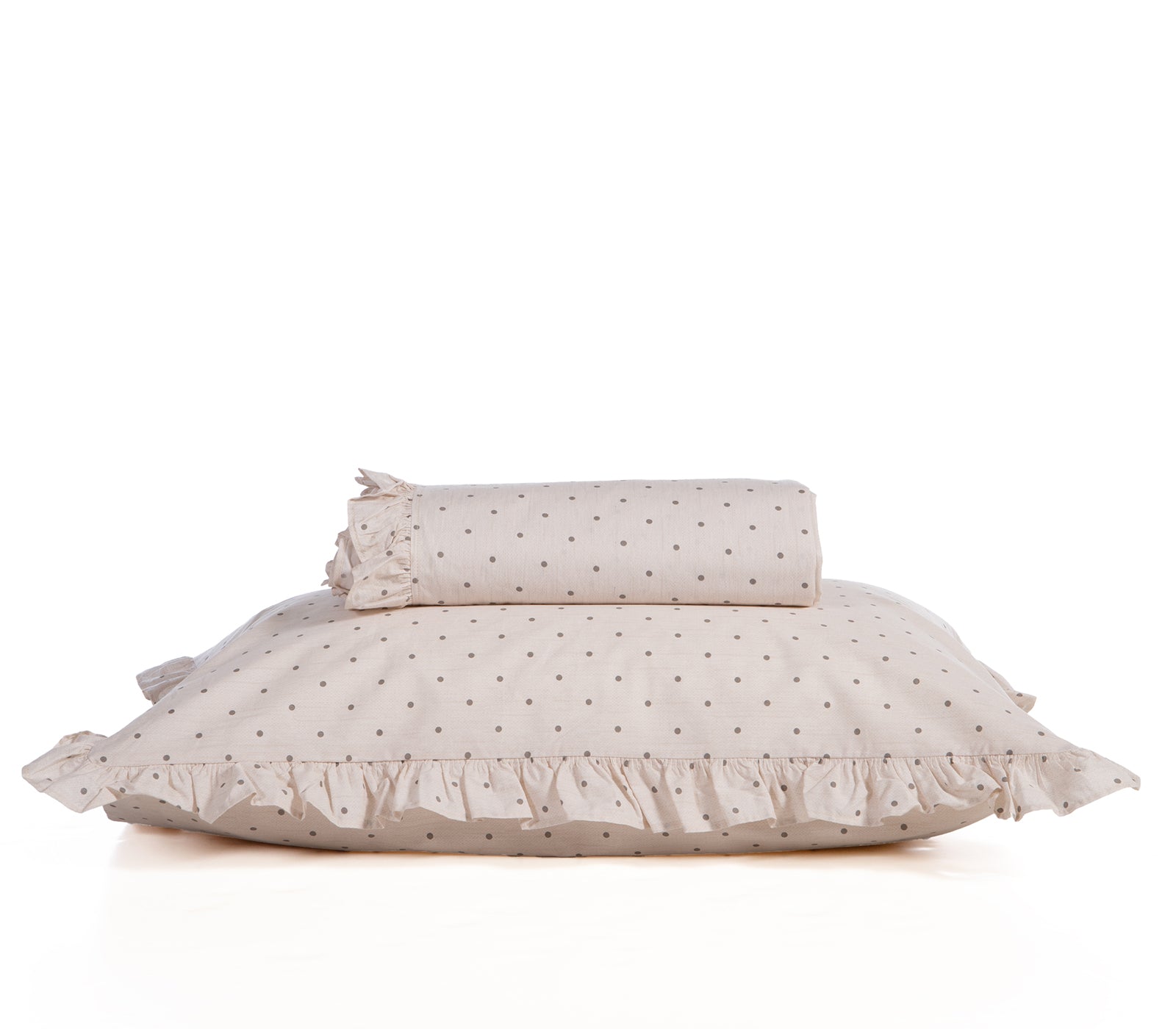 Σετ παπλωματοθήκη υπέρδιπλη μπεζ με πουά μοτίβο της εταιρείας Nef-Nef Homeware, από βαμβακερό-περκάλι.Το σετ περιλαμβάνει μία παπλωματοθήκη διάστασης 240x230 cm με φερμουάρ, σε μπεζ βάση διακοσμημένη με μικρό πουά σχέδιο και λεπτομέρεια βολάν στην περίμετρο, καθώς και δύο μαξιλαροθήκες διάστασης 52x72 cm με το ίδιο κομψό σχέδιο και βολάν γύρω από τις άκρες.Μια ρομαντική πρόταση που θα χαρίσει στο υπνοδωμάτιό σας ζεστασιά και ανανεώση. Ολοκληρώστε το αποτέλεσμα με σεντόνια και παπλώματα που ενσωματώνονται ιδανικά στην αισθητική του χώρου σας.
