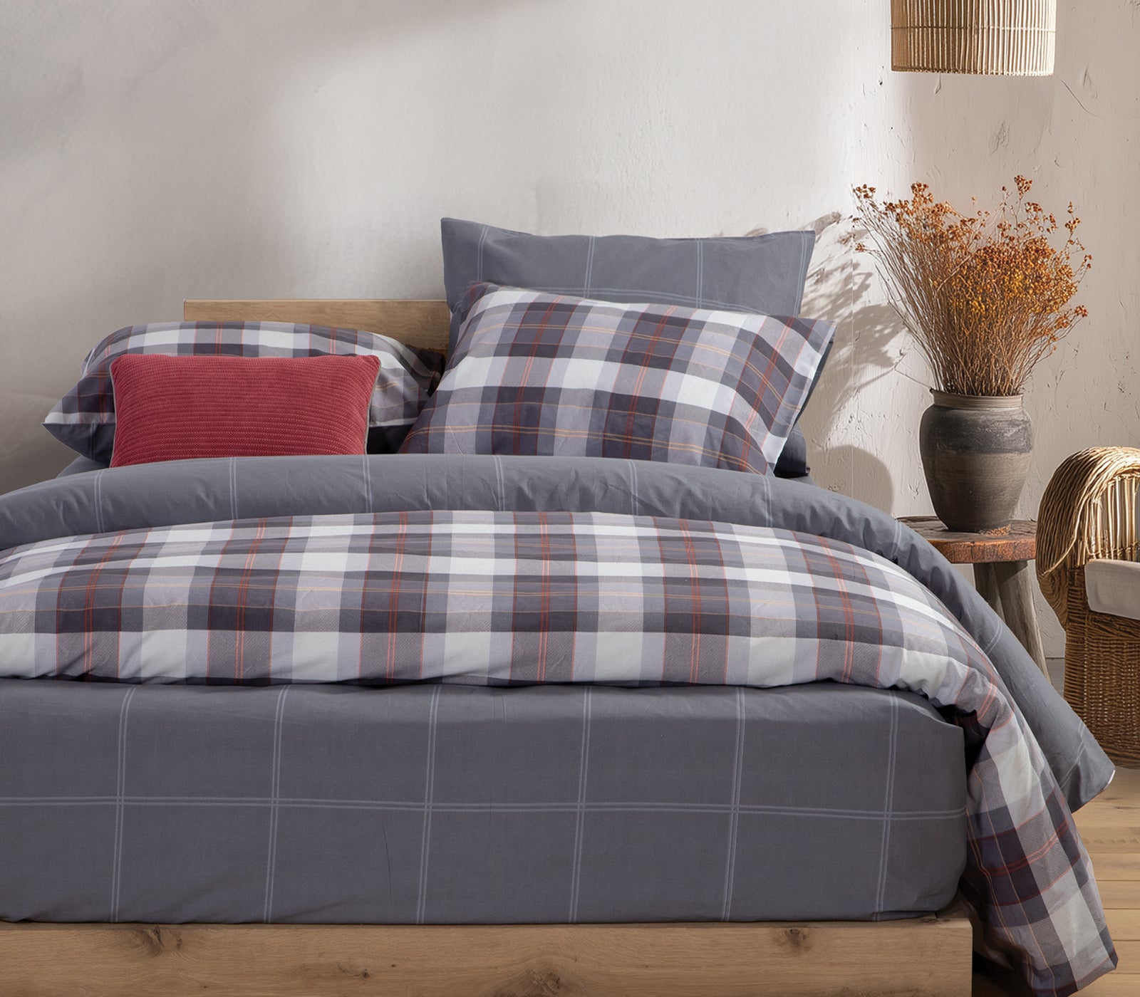 Σετ παπλωματοθήκη υπέδιπλη σε μπλε χρώμα με καρό μοτίβο της εταιρείας Nef-Nef Homeware, κατασκευασμένη από 100% βαμβάκι. Το σετ περιλαμβάνει μία παπλωματοθήκη διάστασης 240x230 cm και μία μαξιλαροθήκη διάστασης 52x72 cm. Η παπλωματοθήκη κλείνει με φερμουάρ και είναι διπλής όψης, με την εξωτερική πλευρά σε έντονο καρό σχέδιο σε μπλε απόχρωση, ενώ η εσωτερική διαθέτει πιο διακριτικό καρό μοτίβο σε μπλε τόνους. Η μαξιλαροθήκη ακολουθεί το ίδιο σχέδιο με την παπλωματοθήκη αντίστοιχα . Μια ζεστή και κομψή επιλογή που προσθέτει φθινοπωρινή αίσθηση και στυλ στο υπνοδωμάτιο.Ανανεώστε το υπνοδωμάτιο σας, επιλέγοντας σεντόνια και παπλώματα που δένουν άψογα μεταξύ τους.