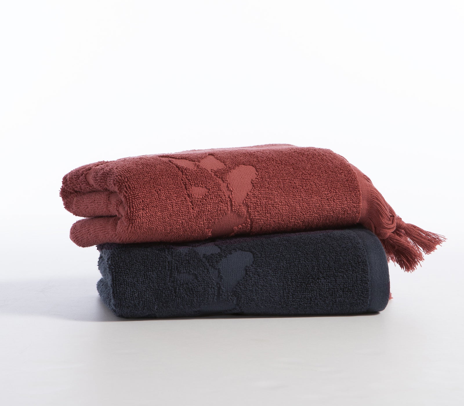 Δύο πετσέτες μπάνιου σε ροζ και σκούρο μπλε χρώμα με σχέδιο φύλλα, τοποθετημένες η μία πάνω στην άλλη.