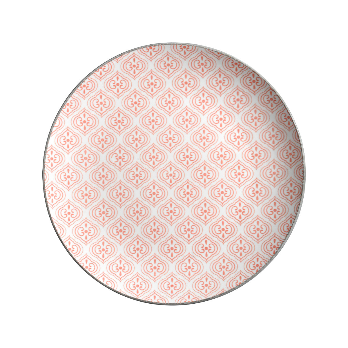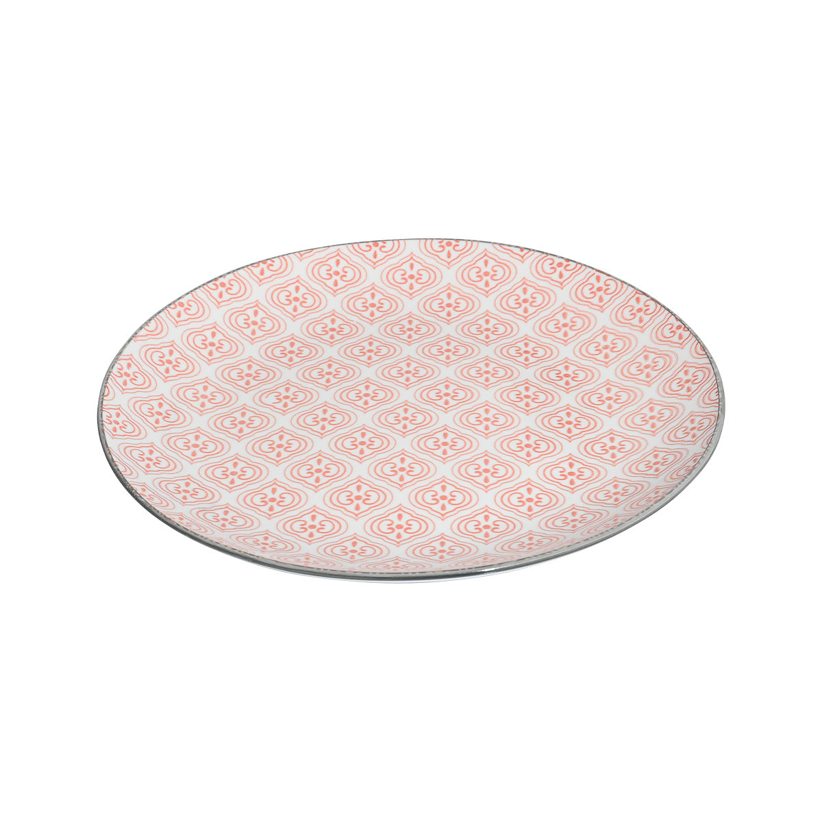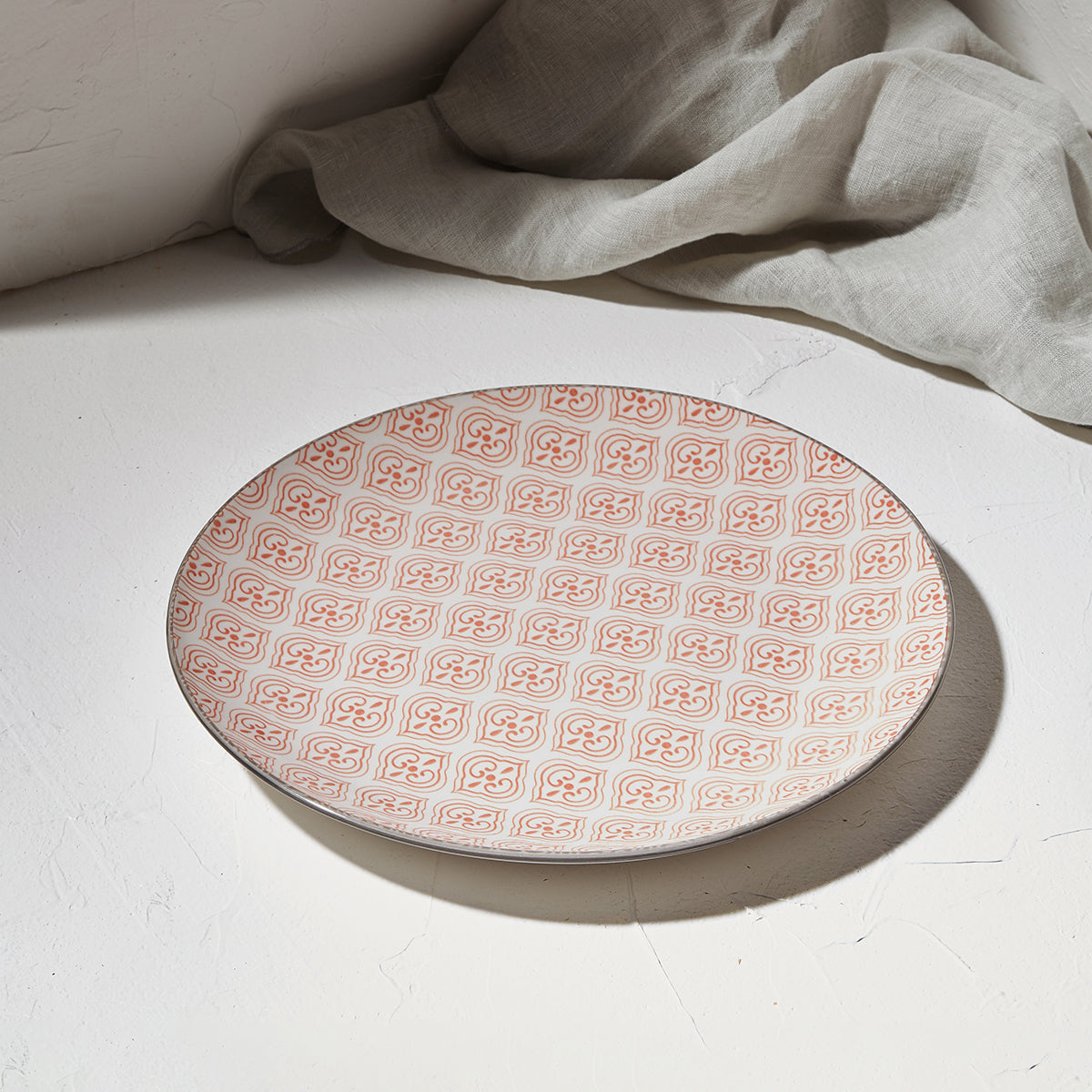 Πιάτο ρηχό Antique της εταιρείας Estia, κατασκευασμένο από πορσελάνη σε λευκή απόχρωση με διακριτικό γεωμετρικό σχέδιο σε κοραλί χρώμα. Το ιδιαίτερο μοτίβο αναδεικνύεται στο εσωτερικό του πιάτου, ενώ το λεπτό περίγραμμα σε απαλή απόχρωση προσθέτει κομψότητα. Η επιφάνεια είναι λεία και γυαλιστερή, ενισχύοντας την καθαρότητα των χρωμάτων και την αίσθηση φρεσκάδας στο τραπέζι. Συνδυάζει διαχρονική αισθητική με μία ανάλαφρη καλοκαιρινή διάθεση. Ιδανικό για καθημερινή χρήση αλλά και πιο ξεχωριστές περιστάσεις, φέρνει χρώμα και στυλ σε κάθε τραπέζι. Ένα πιάτο που κάνει την παρουσίαση του φαγητού σας πιο απολαυστική.