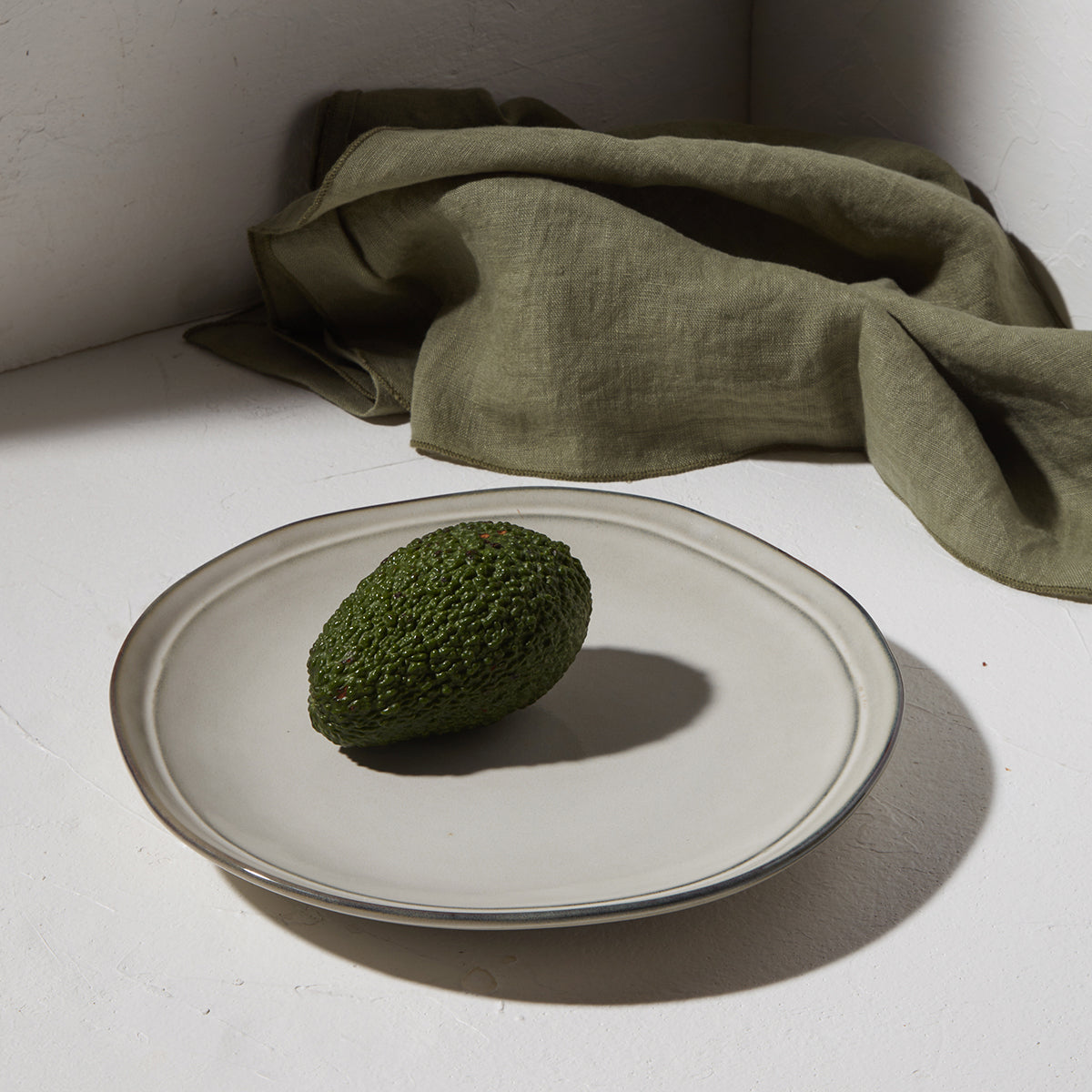 Πιάτο Deline γκρι απόχρωσης με αβοκάντο σε λευκή επιφάνεια και πράσινο ύφασμα στο φόντο.