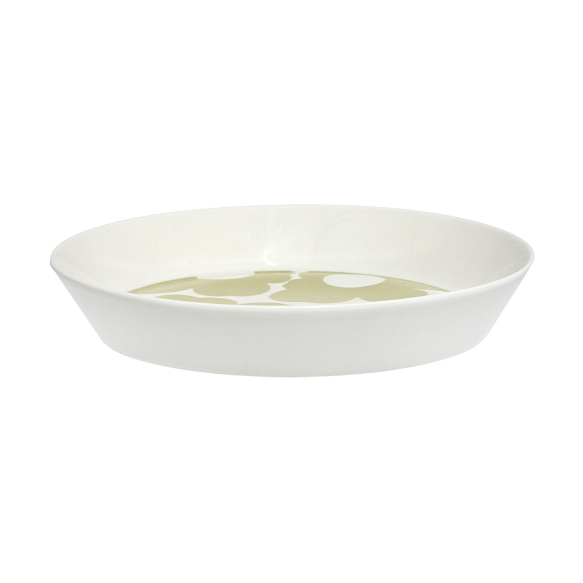 Βαθύ πορσελάνινο πιάτο με μπεζ φλοράλ σχέδιο σε λευκή βάση και καθαρό φόντο.