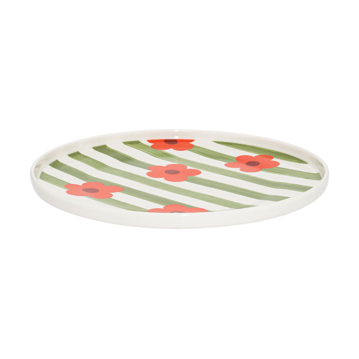 Πιάτο Ρηχό Πράσινο-Λευκό με Ριγέ Σχέδιο & Κόκκινα Λουλούδια Πορσελάνινο 27cm