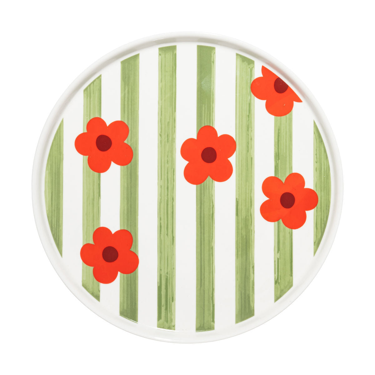 Λευκό πιάτο με ριγέ πράσινο σχέδιο και έντονα κόκκινα φλοράλ στοιχεία σε καθαρό φόντο.