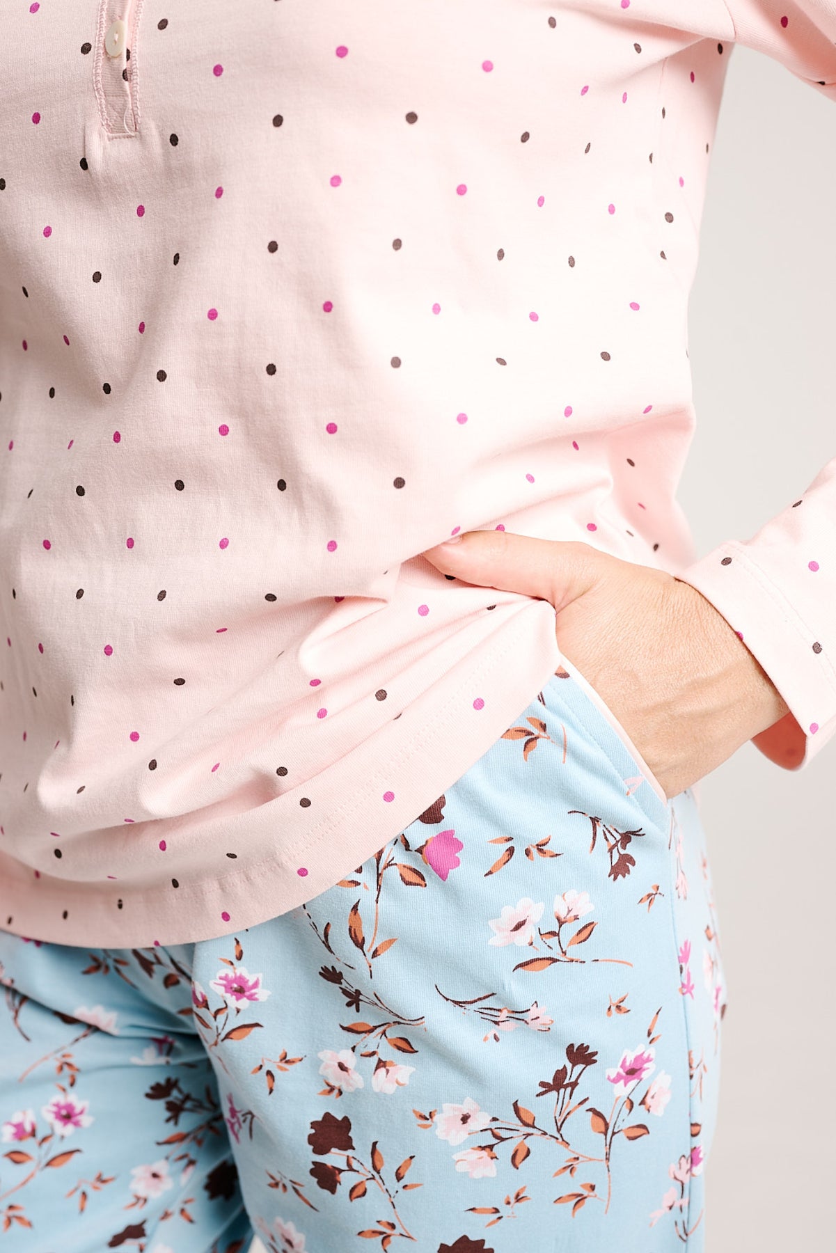 Γυναικεία χειμερινή πιτζάμα της εταιρείας Muy Demi κατασκευασμένη από 100% βαμβάκι σε απαλούς ροζ-γαλάζιους τόνους με παιχνιδιάρικα σχέδια. Το επάνω μέρος διαθέτει κουμπιά στη λαιμόκοψη και διακριτικό πουά μοτίβο, ενώ το παντελόνι σε γαλάζια βάση είναι διακοσμημένο με φλοράλ λεπτομέρειες και λάστιχο στους αστραγάλους για άνετη εφαρμογή. Ένα κομψό και χαριτωμένο σύνολο που θα σας χαρίσει στυλ και άνεση σε κάθε στιγμή χαλάρωσης στο σπίτι.