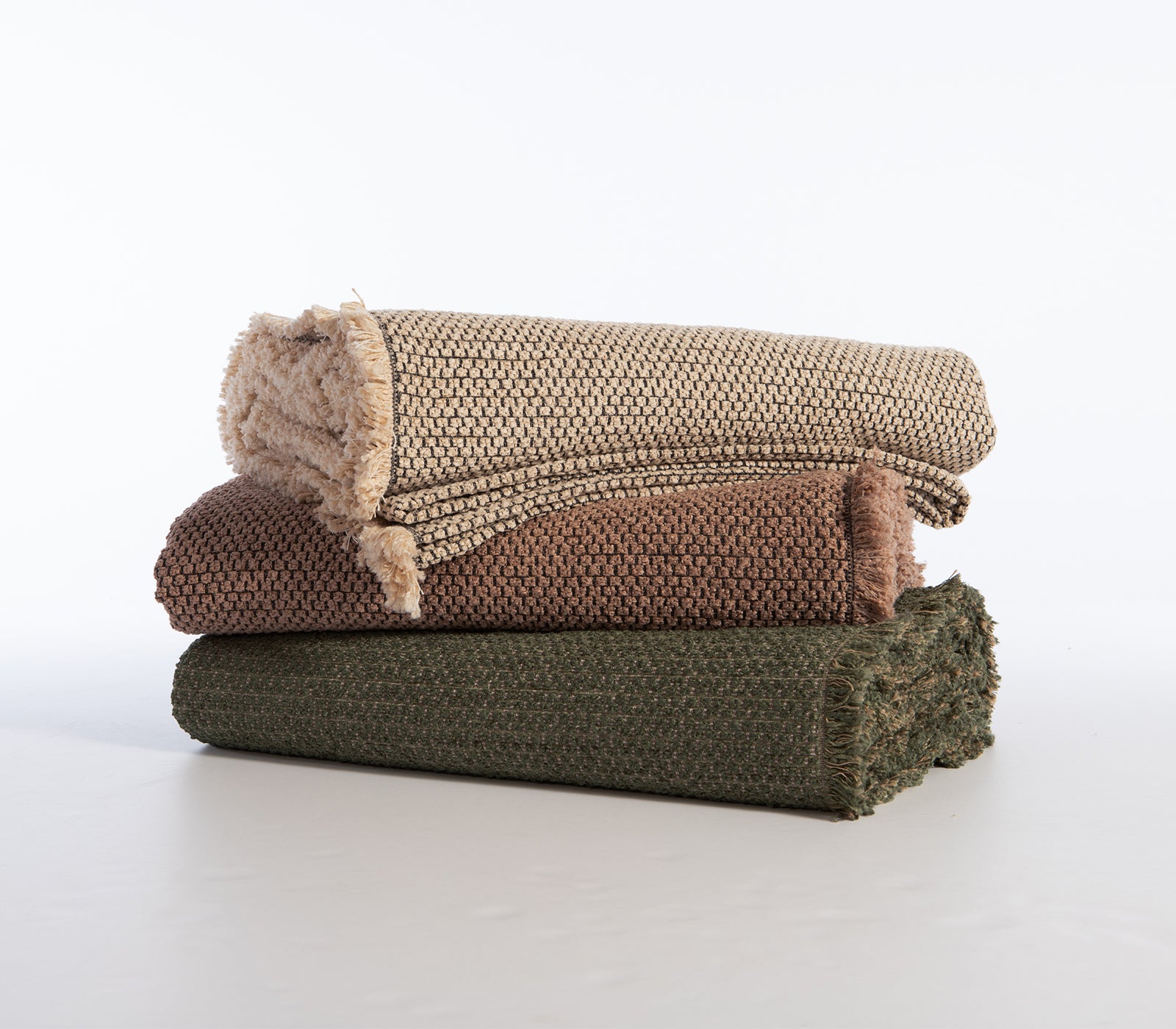 Τρία διπλωμένα ριχτάρια σε εκρού, καφέ και χακί χρώμα, τοποθετημένα το ένα πάνω στο άλλο.