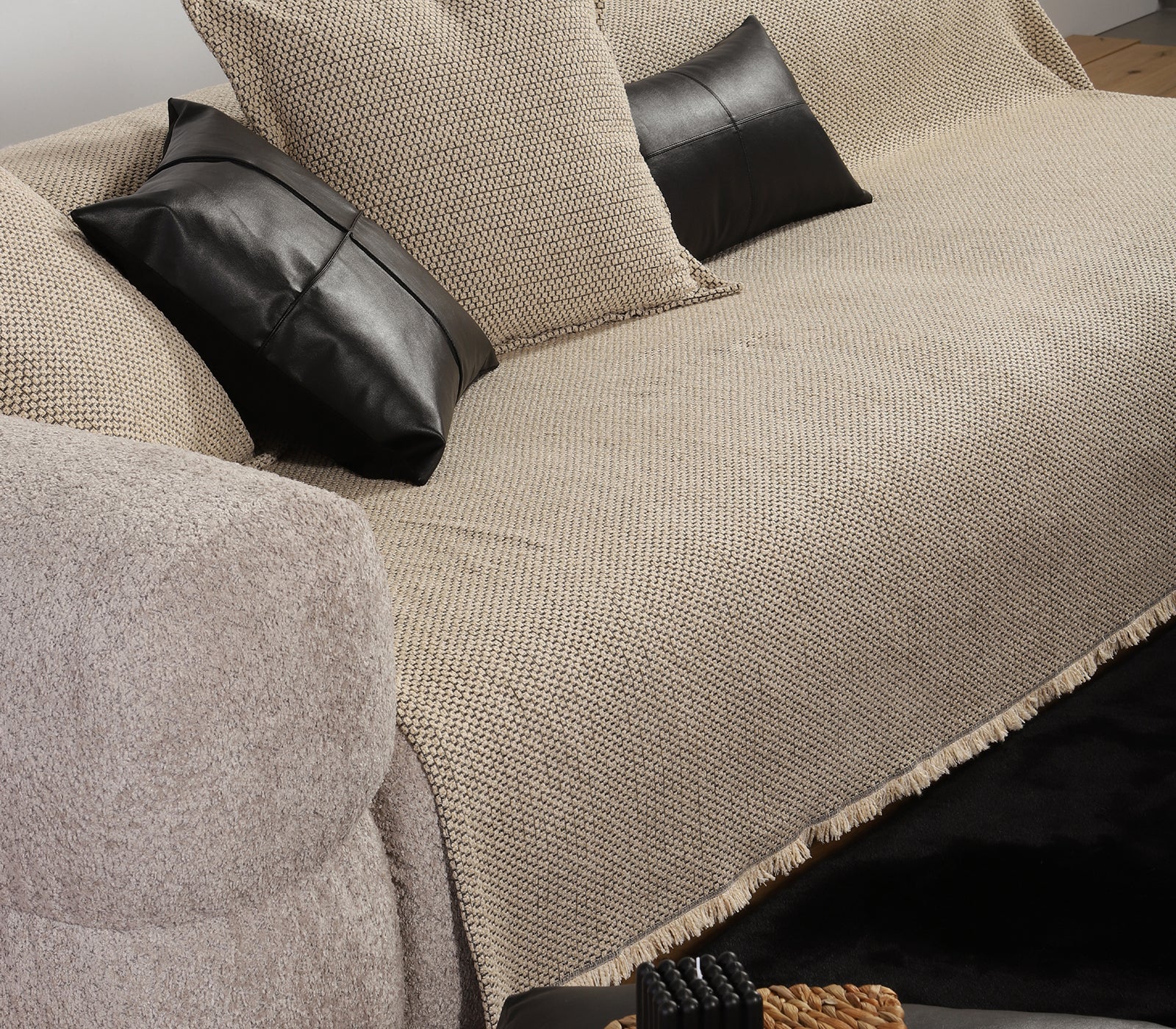 Εκρού ριχτάρι με υφή πλέξης σε καναπέ, συνδυασμένο με μαύρα δερμάτινα μαξιλάρια και διακοσμητικά σε ουδέτερο φόντο.