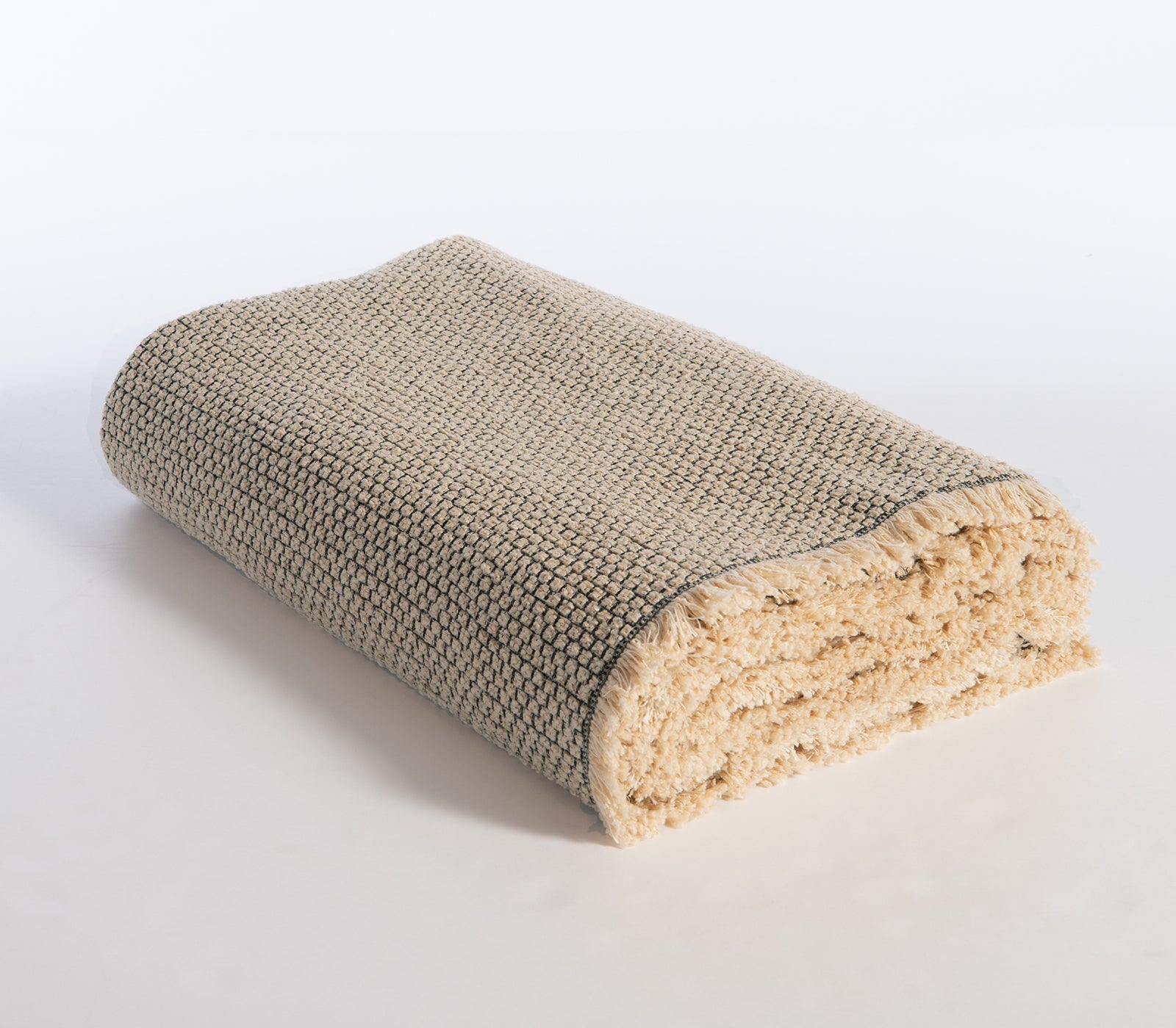 Διπλωμένο εκρού ριχτάρι με υφή πλέξης και κρόσσια στο τελείωμα.