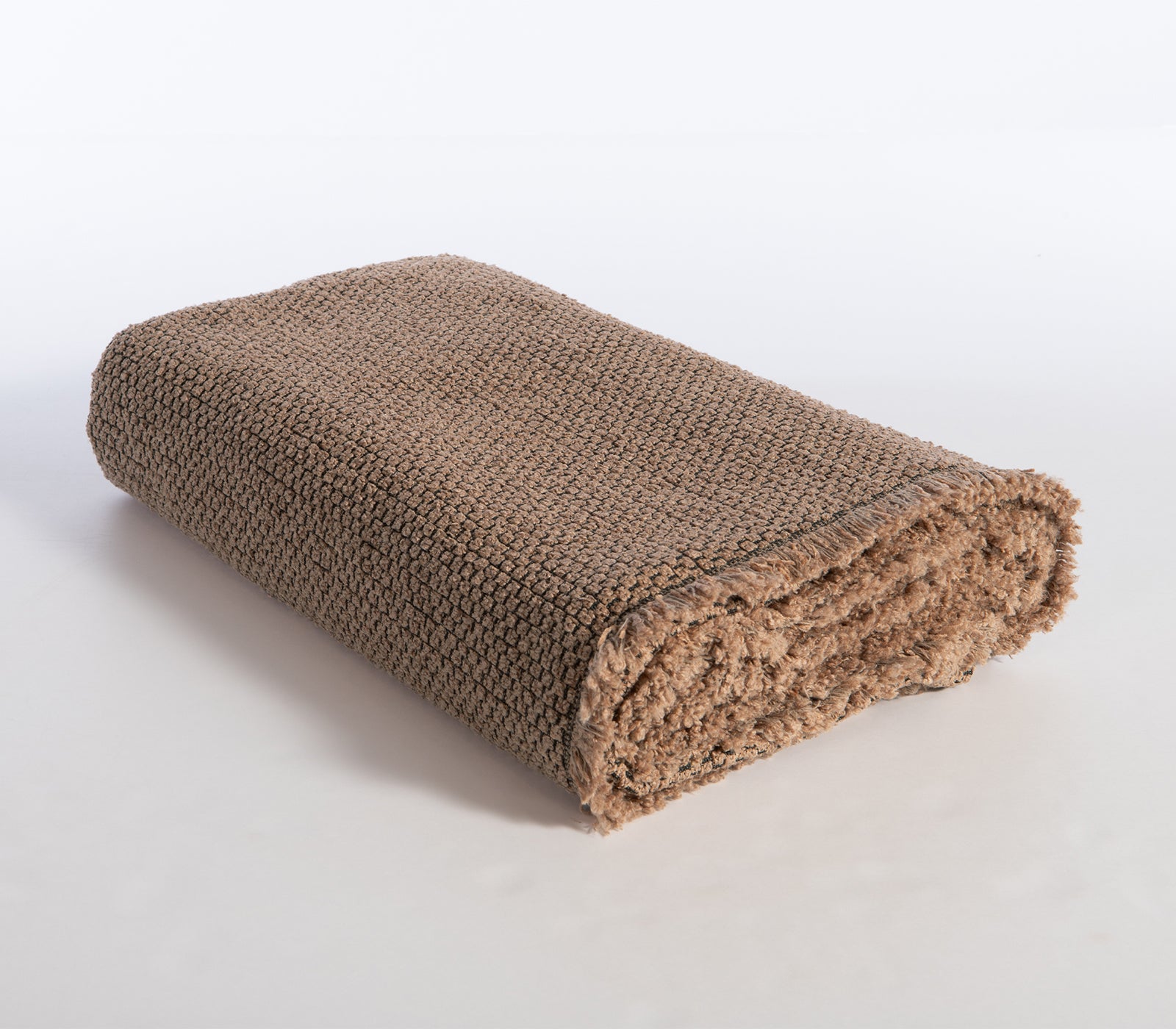 Καφέ ριχτάρι διπλωμένο με εμφανή την πλεκτή υφή και τα κρόσσια στο τελείωμα.