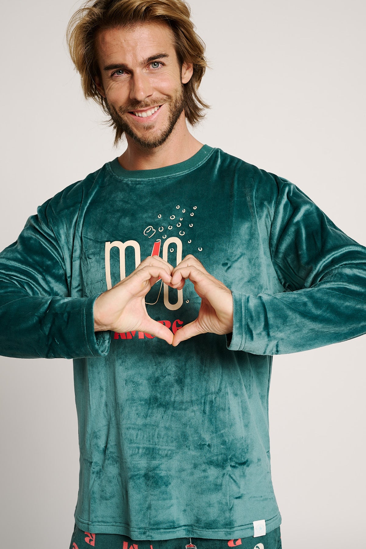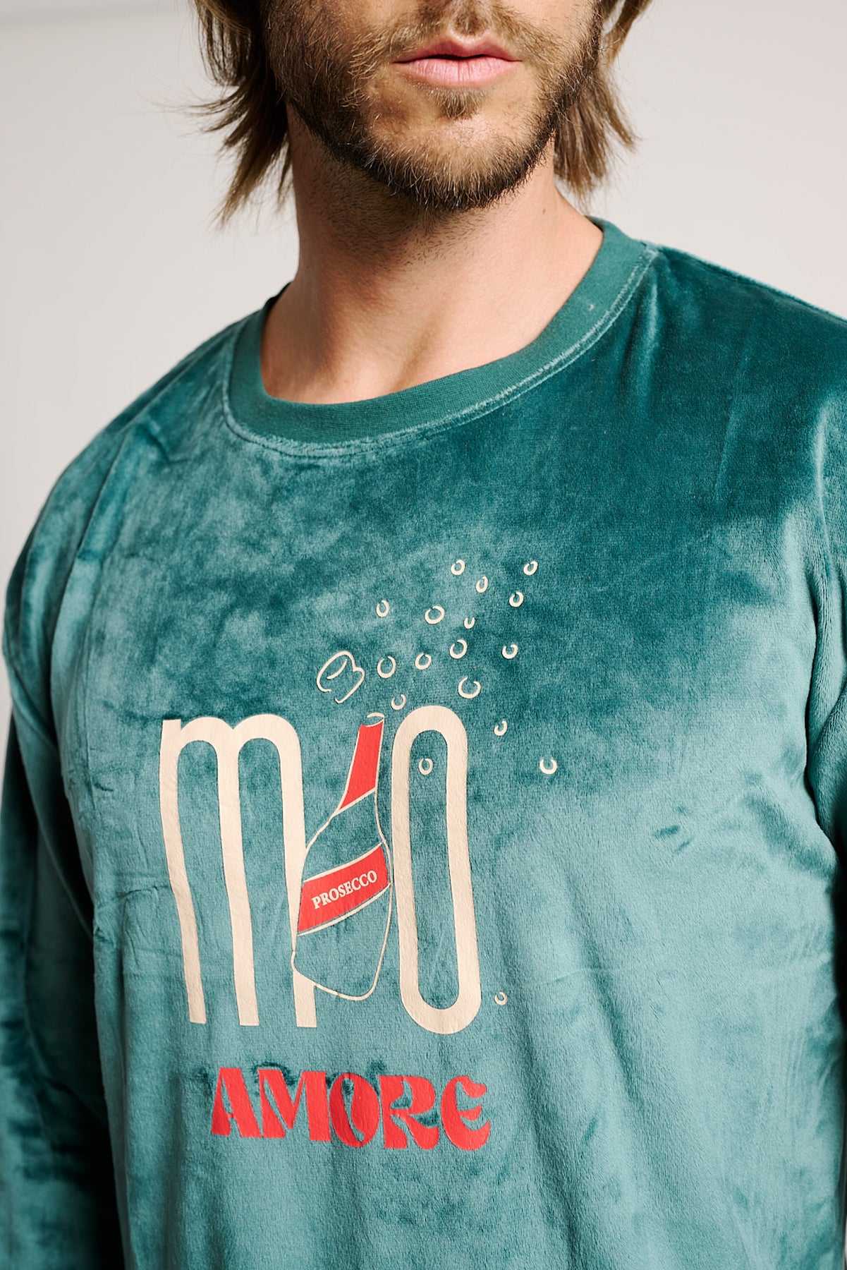 Κοντινό πλάνο σε πράσινη βελούδινη μπλούζα πιτζάμας με στάμπα 'Mio Amore' όπου φαίνεται η λαιμόκοψη