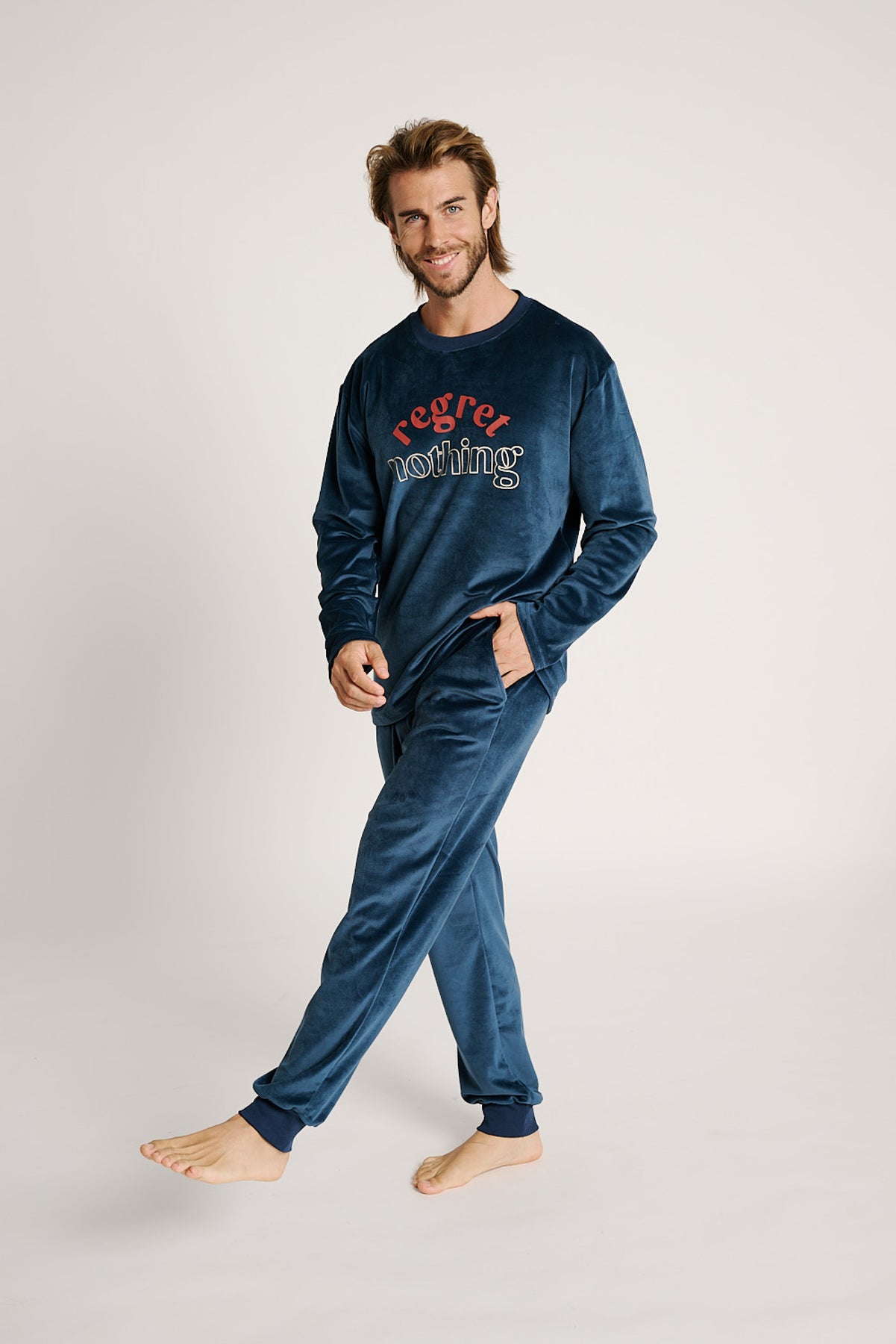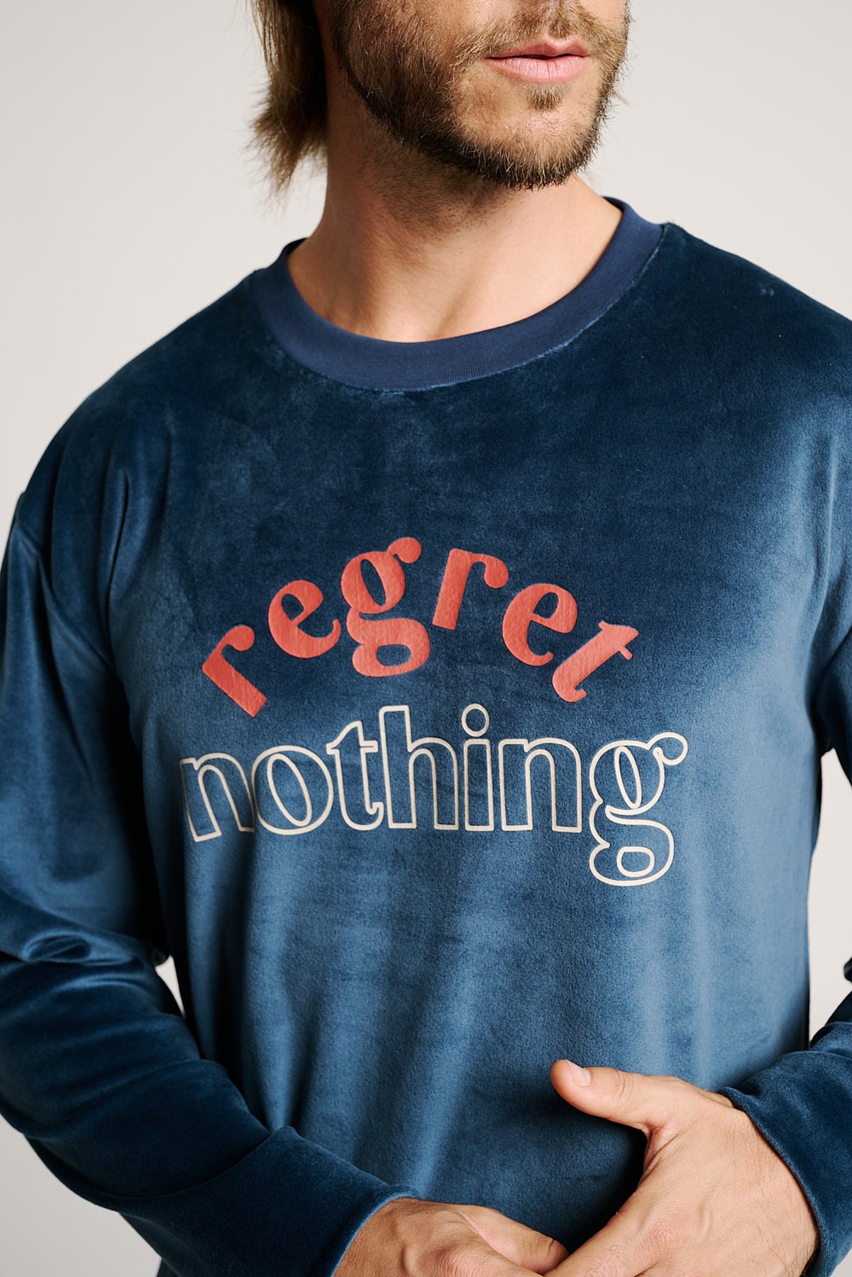 Άνδρας ποζάρει με το ένα χέρι στην τσέπη φορώντας σετ βελούδινη μπλε πιτζάμα με λογότυπο "Regret Nothing"
