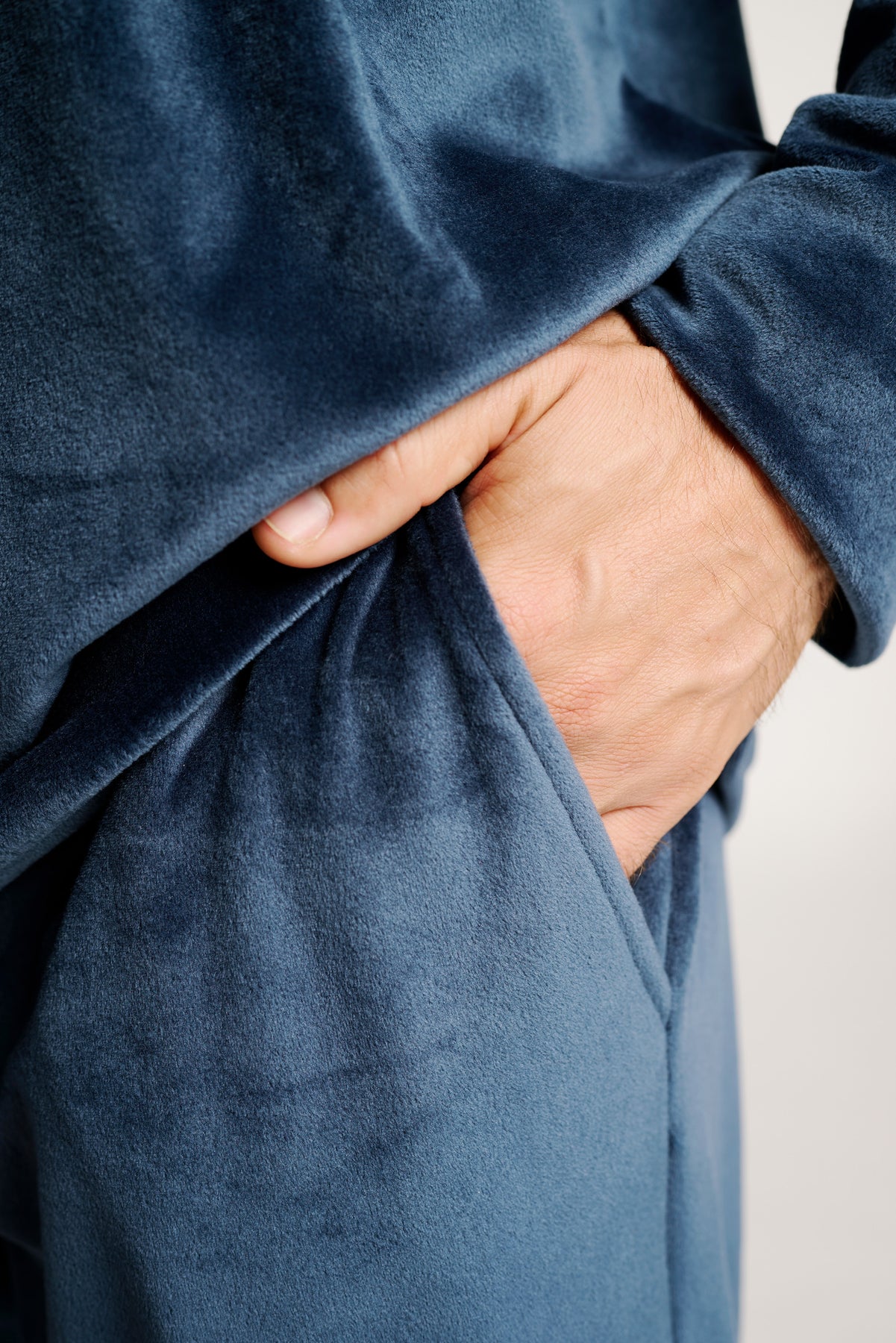 Κοντινό πλάνο σε ανδρικό σετ βελούδινη μπλε πιτζάμα με λογότυπο "Regret Nothing" όπου φαίνεται το χέρι του άνδρα μέσα στην τσέπη, σε ουδέτερο φόντο