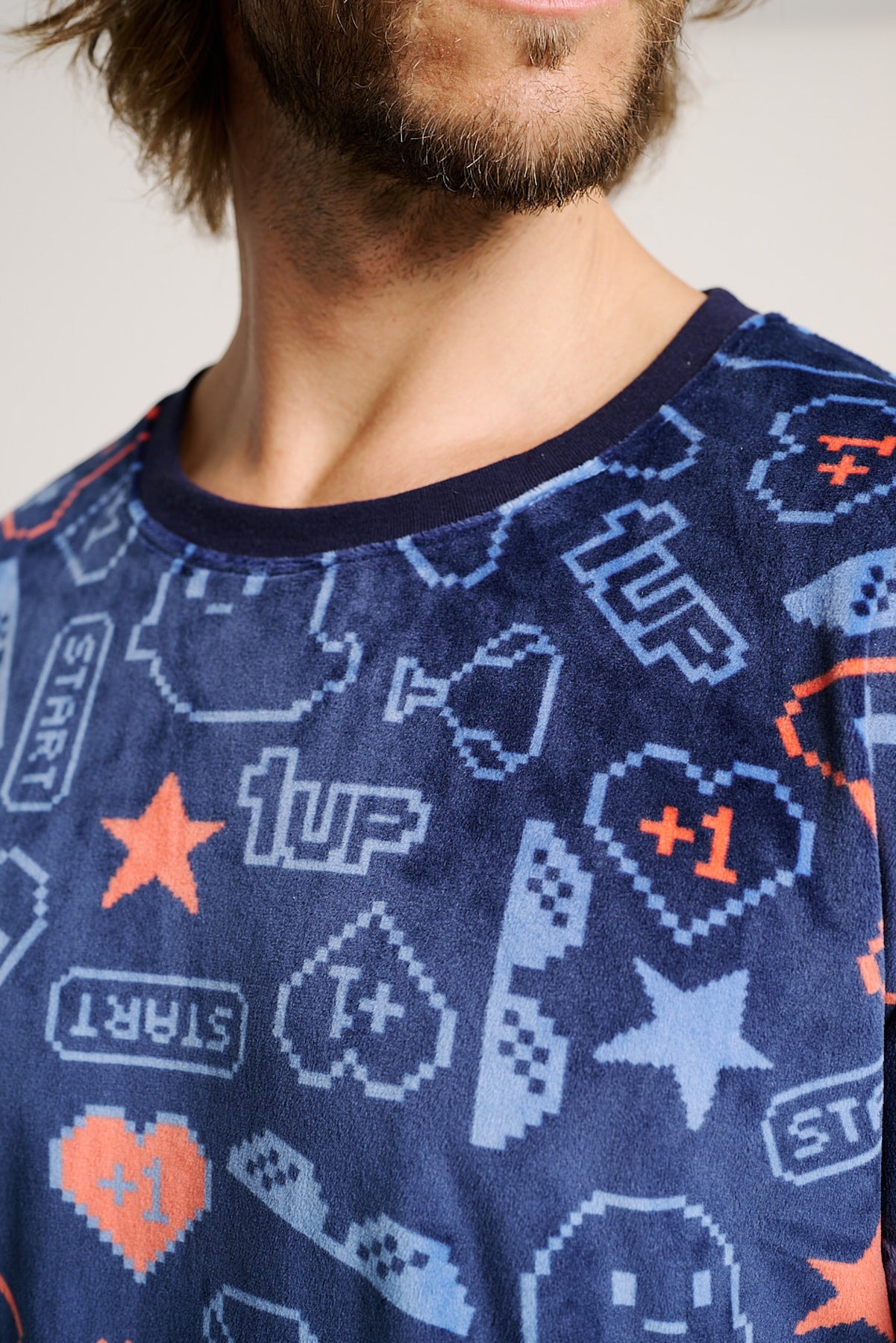 Άνδρας ποζάρει φορώντας βελούδινη πιτζάμα με την μπλούζα να είναι μπλε σκούρο με πολύχρωμα σχέδια από video games σε κόκκινο, γαλάζιο και γκρι, ενώ το παντελόνι είναι μονόχρωμο μπλε βελούδινο, σε ουδέτερο φόντο