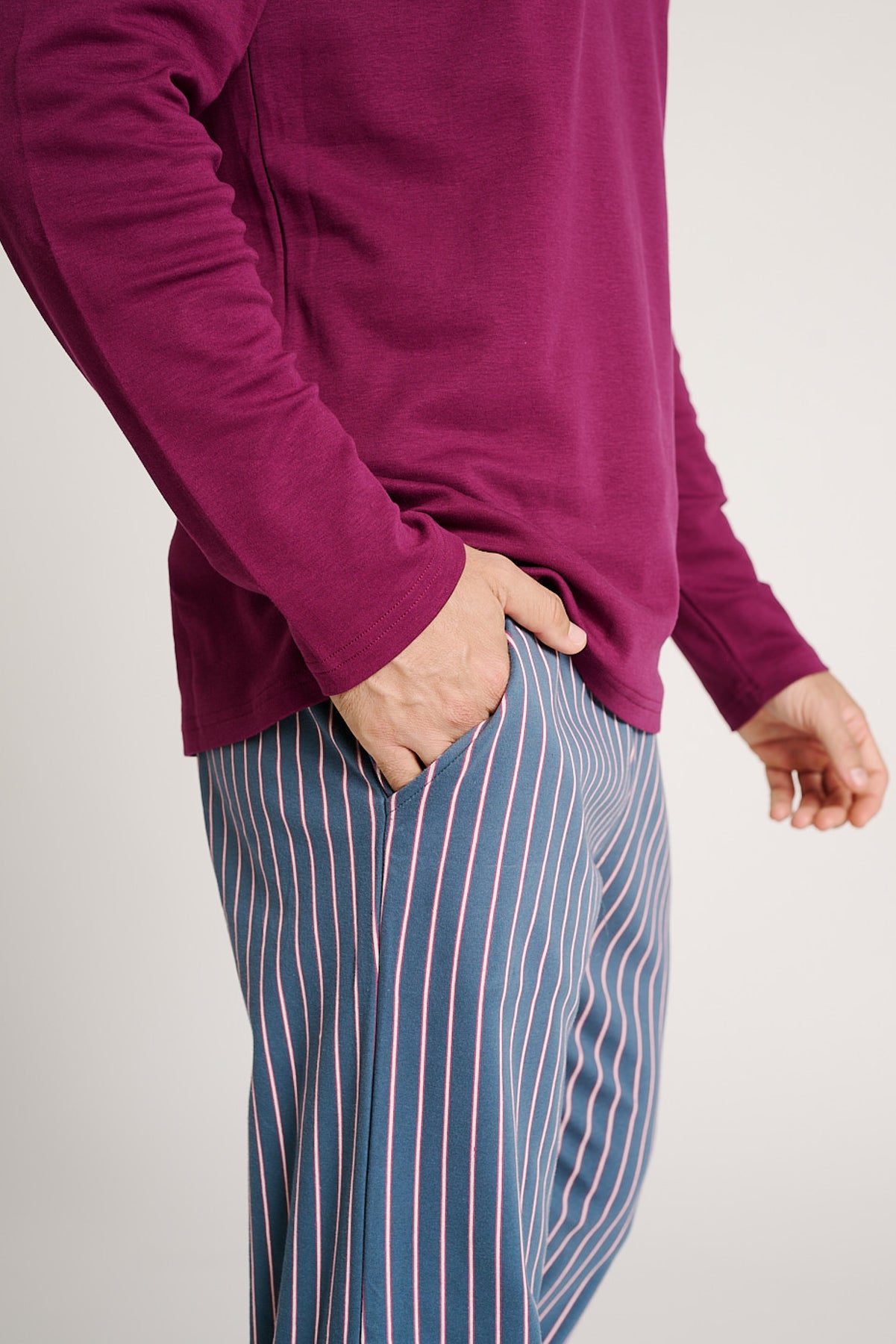 Κοντινό πλάνο σε σετ πιτζάμας με μπορντό μπλούζα και μακριά μανίκια και μακρύ ριγέ γαλάζιο με ροζ παντελόνι όπου φαίνεται το χέρι του άνδρα μέσα στην τσέπη σε ουδέτερο φόντο